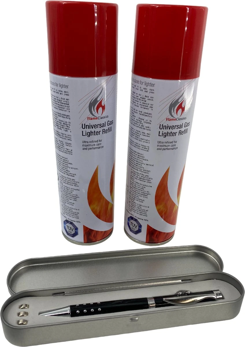 | Fonctions supplémentaires | Gaz pour recharger votre briquet rechargeable, y compris divers accessoires!Enfin, ayez toujours un stylo à portée de main avec ces deux stylos à bille laser uniques inclus |