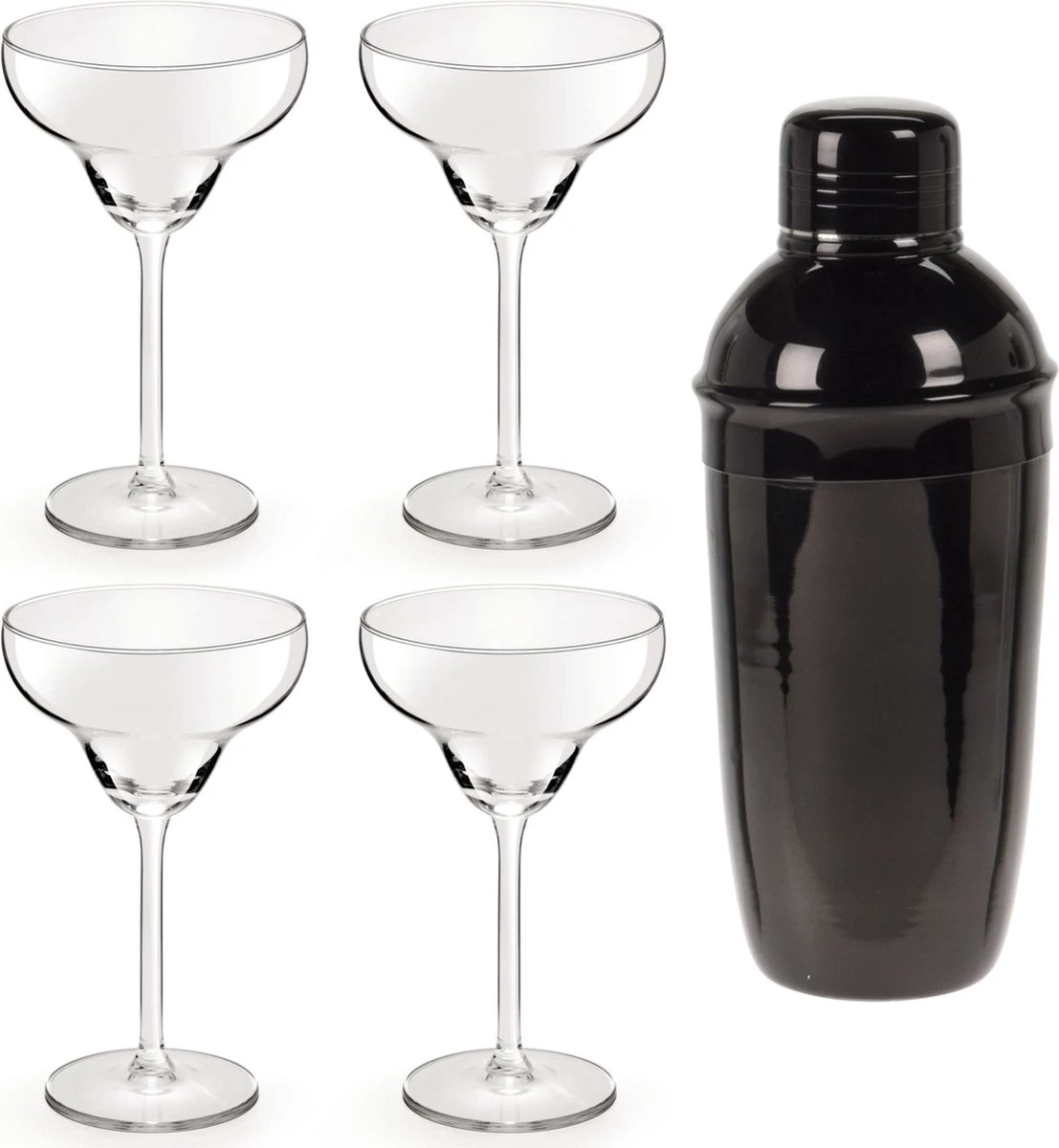 4x Verres à Verres à cocktail / Verres à margarita transparents 300 ml + Shaker à cocktail noir 500 ml en acier inoxydable Contenu : 300 ml (30cl) Convient pour : lave-vaisselle. Matière : verre. Taille : Diamètre du verre : 10,5 cm. Comprend un shaker noir. Dimensions: environ D9 x H22 cm. Contenu: environ 500 ml. Matériau : acier inoxydable. Va au lave-vaisselle: oui. Avec ce shaker, vous pouvez préparer les cocktails les plus savoureux très facilement et rapidement ! Ajouter tous les ingrédients, bien agiter, puis verser dans un verre. composé de 1x 4x Verres à cocktail transparents 300 ml Margarita, 1x Shaker à cocktail noir 500 ml en acier inoxydable