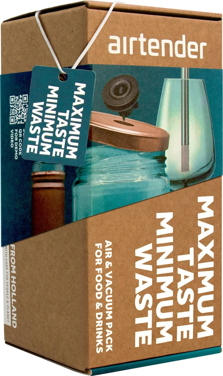 Avec cet ensemble dans un bel emballage en carton kraft respectueux de l’environnement, vous obtenez la collection complète de pompes à main Airtender à la maison ! Gardez les aliments et les boissons frais et parfaitement aromatisés plus longtemps. Transformez n’importe quel pot de conserve en un récipient de stockage sous vide pour la fraîcheur, la marinade et l’infusion en un rien de temps. Aérez chaque verre de vin pour un maximum de saveur et d’arôme et gardez les bouteilles de vin ouvertes jusqu’à 5 fois plus longtemps. Préparez des cocktails professionnels en un instant et bien plus encore. (1x pompe à vide Airtender, 1x poinçon de couvercle, 6x Nanostopper, 1x clip de stockage Nanostopper, 1x pompe à air Airtender, 1x aérateur de vin en acier inoxydable). La boîte cadeau est également une boîte de rangement solide.