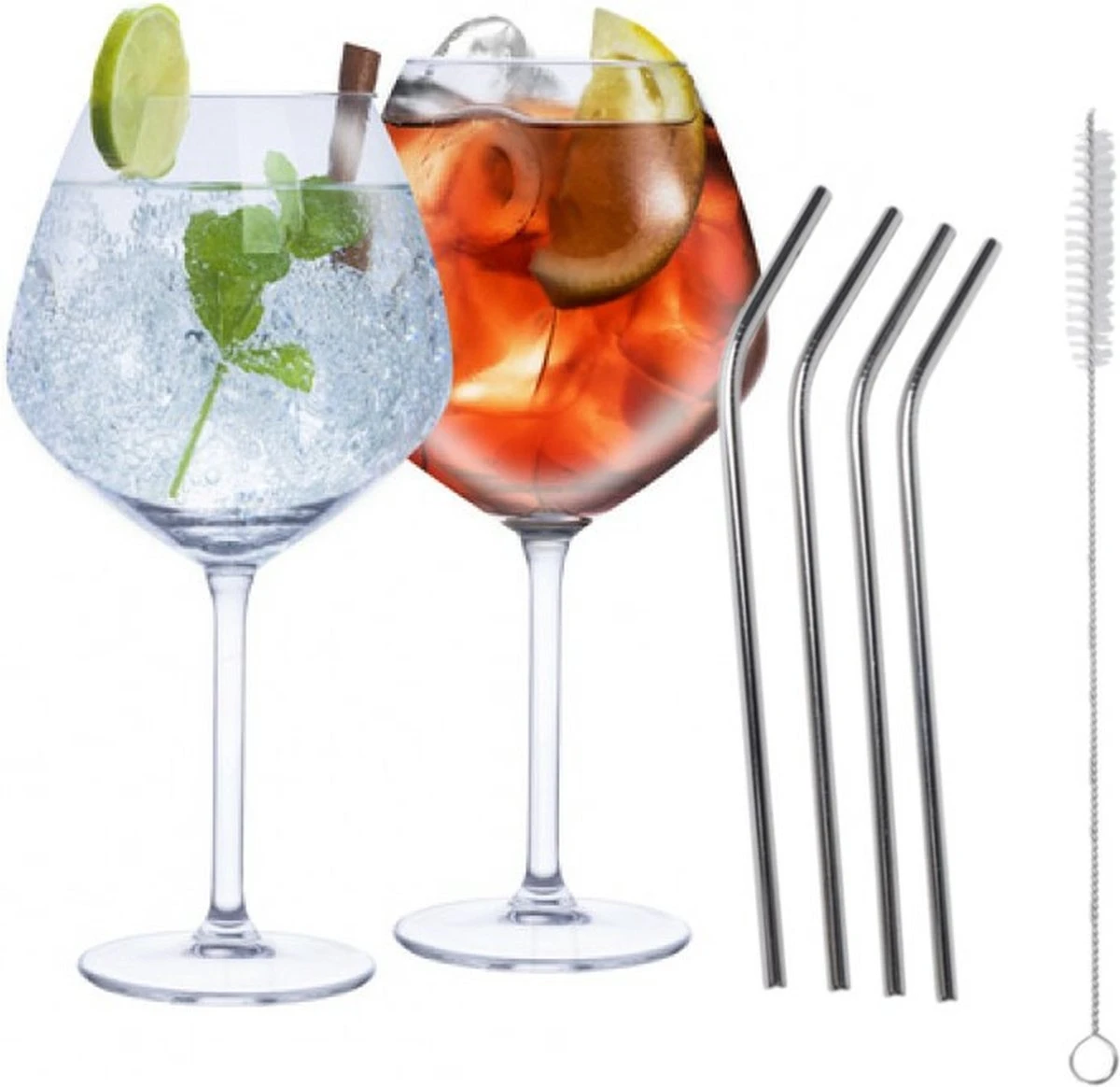 Set de 4 verres à cocktail Gin Tonic avec 4 pailles. Préparez le Gin Tonic ou le Spritz le plus savoureux dans ces verres fantaisie. Les pailles sont réutilisables et donc très durables et respectueuses de l’environnement. Avec la brosse de nettoyage incluse, vous pouvez facilement nettoyer les pailles. Les verres passent au lave-vaisselle, lavez de préférence les pailles à la main. Contenance en verre : 730 ml. Matériau des verres : verre. Matériau des pailles : acier inoxydable. Dimensions du verre : environ D11 x 22,5 cm. Taille de la paille : environ 21,5 cm. composé de 1x pailles courbes en acier inoxydable 4 pièces avec brosse de nettoyage, 1x 4x verres à cocktail Gin Tonic 730 ml