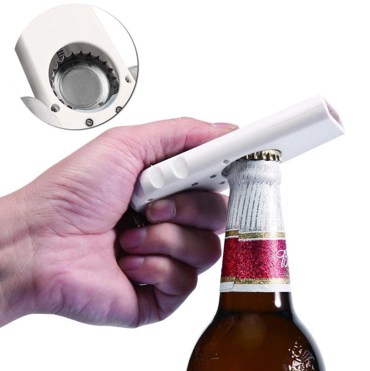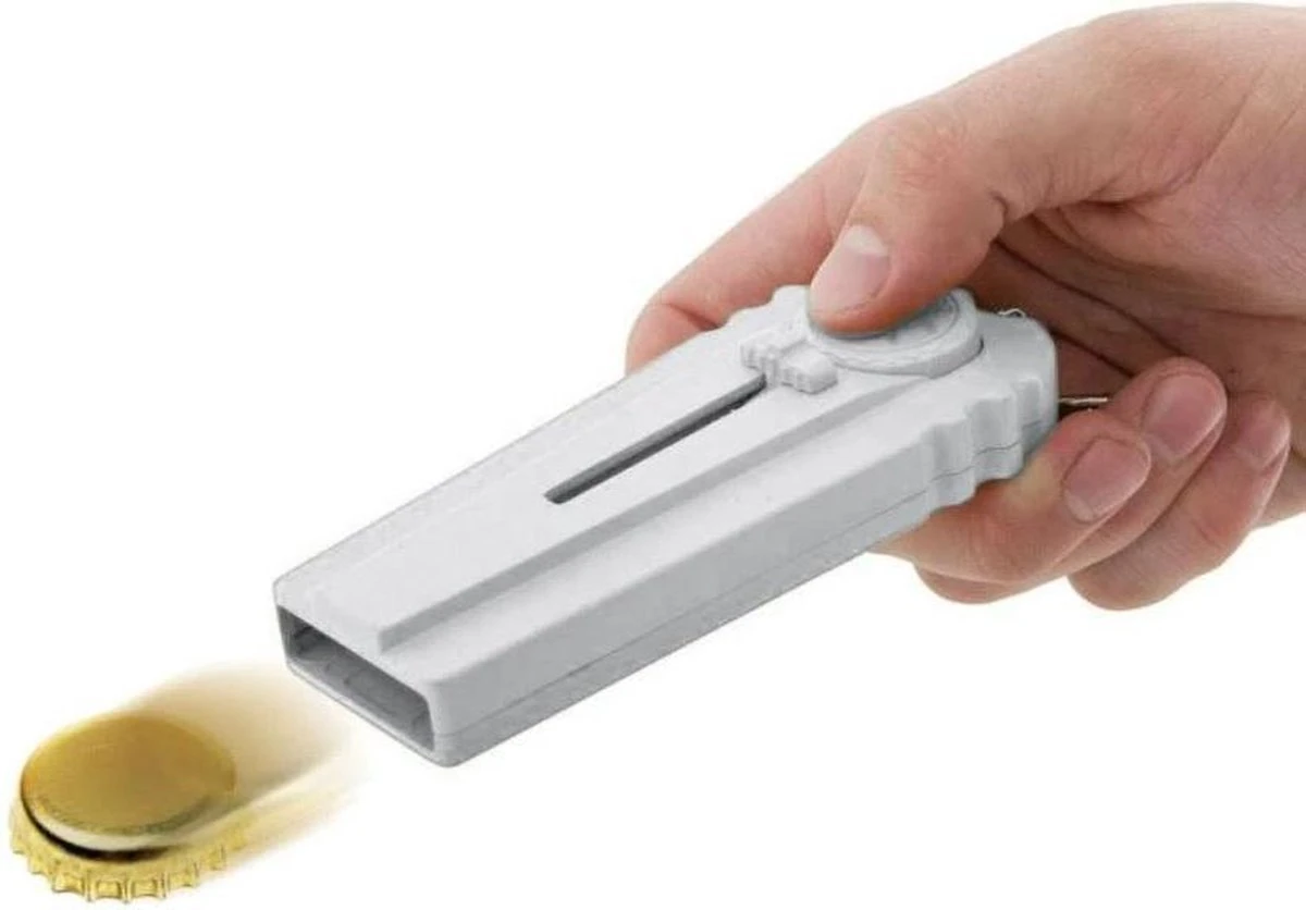 La bonne chose à propos de ce décapsuleur est que vous pouvez l’utiliser comme tireur de casquettes de bière. Après ouverture du flacon, le bouchon reste serré sur l’ouvre-porte. En appuyant sur le bouton sur le dessus de l’ouvre-porte, vous pouvez tirer sur le capuchon jusqu’à cinq mètres. Idéal pour les jeux lors des fêtes et des boissons. Un avantage supplémentaire est que, si vous n’avez pas envie de tirer, l’ouvre-porte garde le bouchon de bière très écologique pour vous.