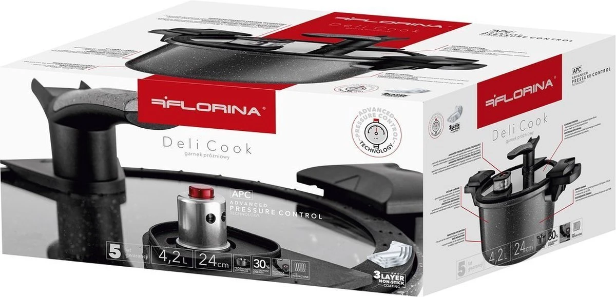 Le Florina Deli Cook dispose d’une valve brevetée spécialement développée qui régule la pression en quelques secondes. Cela permet de soulever le couvercle à tout moment pendant la cuisson. Une casserole bien fermée crée les conditions pour la cuisson sous vide, de sorte que les aliments conservent tous les minéraux précieux, les vitamines et le goût naturel.