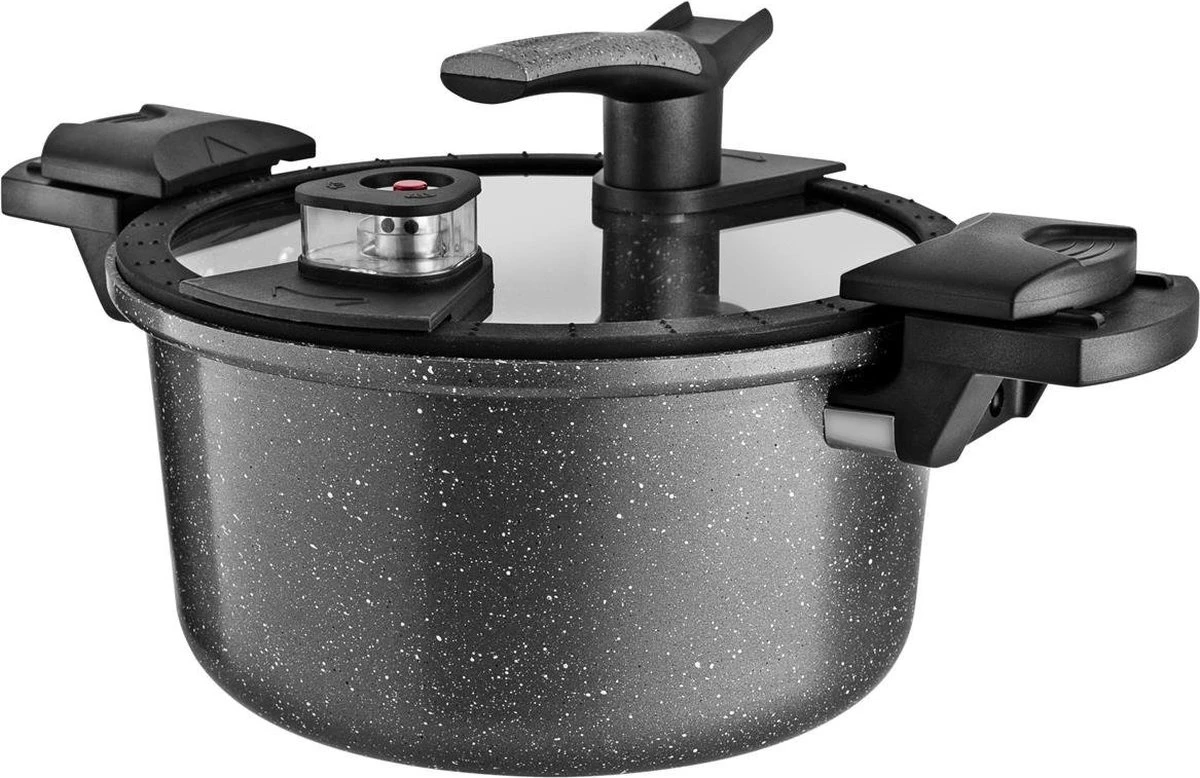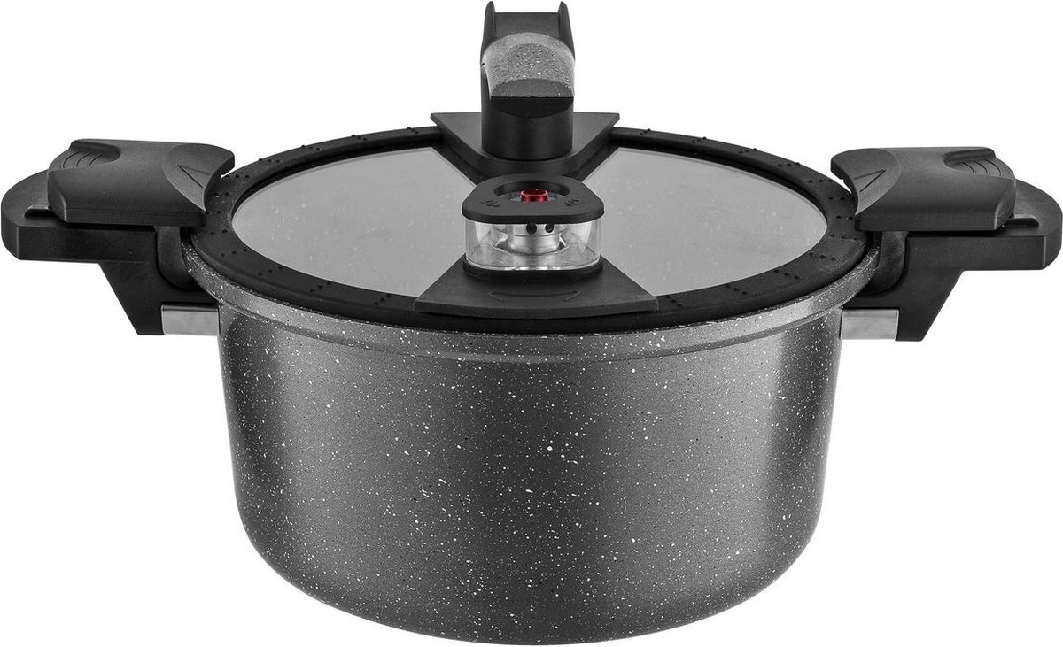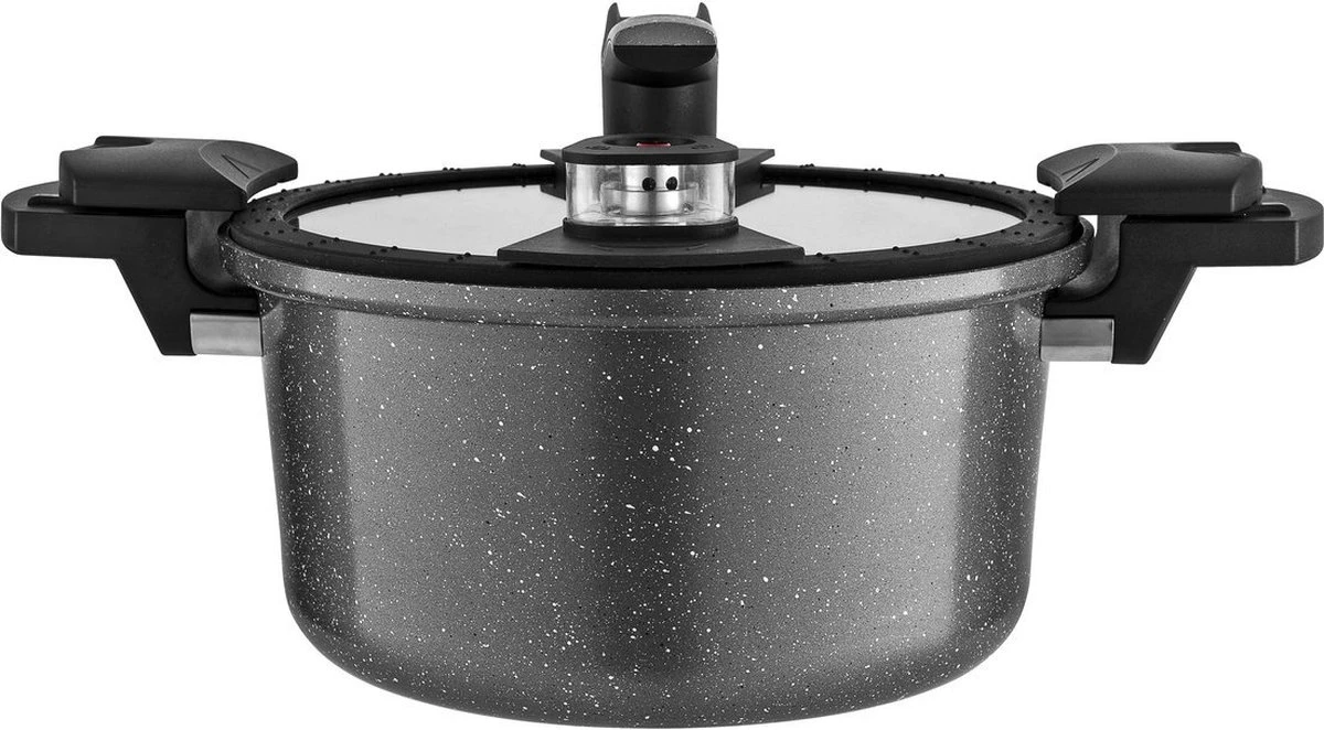 L’autocuiseur a un revêtement en céramique à 3 couches afin que les aliments ne collent pas à la casserole. Le couvercle est en verre trempé. Ce n’est pas seulement sûr, mais vous avez également une vue complète de la nourriture que vous préparez. Les poignées sont en bakélite qui reste froide pour ne pas vous brûler les mains.