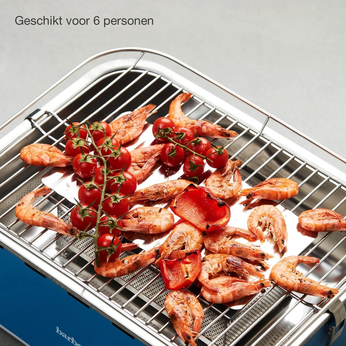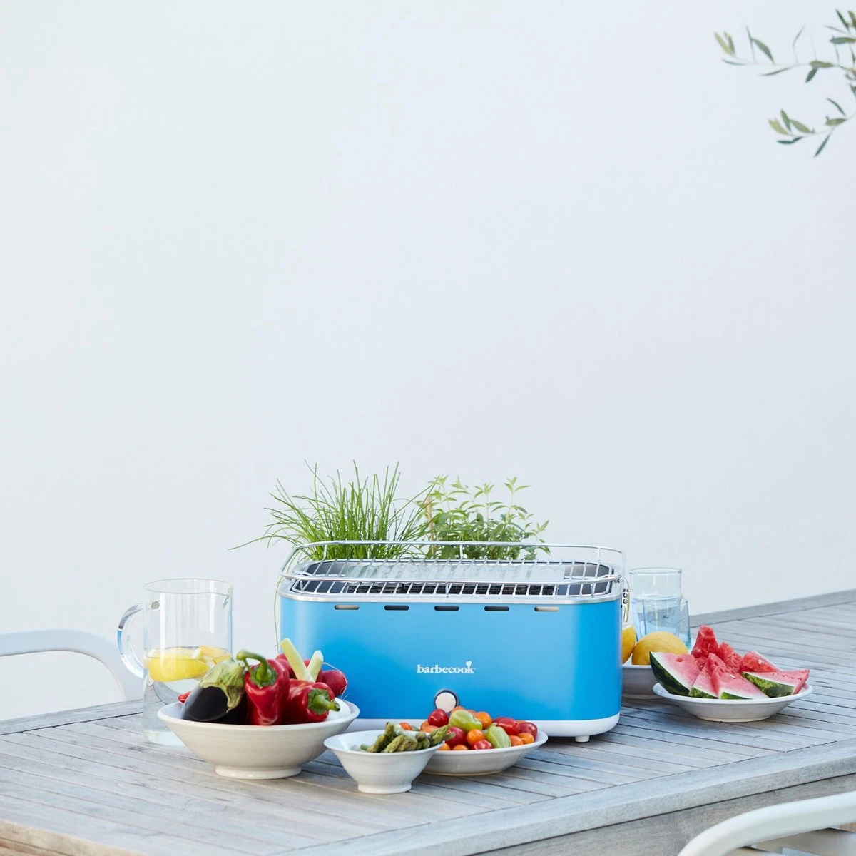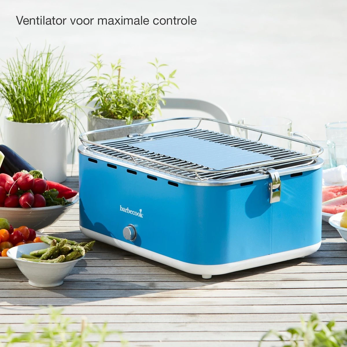 Grâce au design unique du barbecue de table Carlo en bleu gai, vous pouvez désormais griller sans fumée. Avec le ventilateur intégré sur piles AA (non incluses), vous assurez un charbon de bois constant et réglable. Il est rapide et continue de bien brûler grâce à l’air qui circule. De plus, Carlo est extrêmement économique : moins de charbon de bois et plus de résultats ! Le bbq de jardin, le bbq de balcon, le bbq de vacances, le bbq de camping ou le barbecue de table sur charbon de bois.