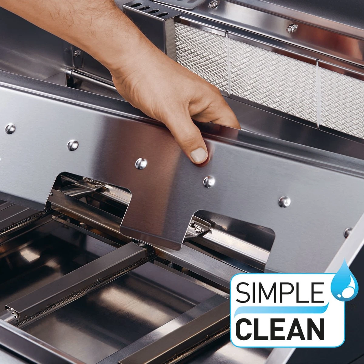 Grâce au système de nettoyage Simple Clean , l’ensemble de la boîte du gril, ainsi que les couvercles de flamme et les tiroirs à graisse, peuvent être retirés à la main sans outils. Vous pouvez facilement nettoyer votre gril après utilisation et simplement mettre les pièces sensibles à la saleté dans le lave-vaisselle.