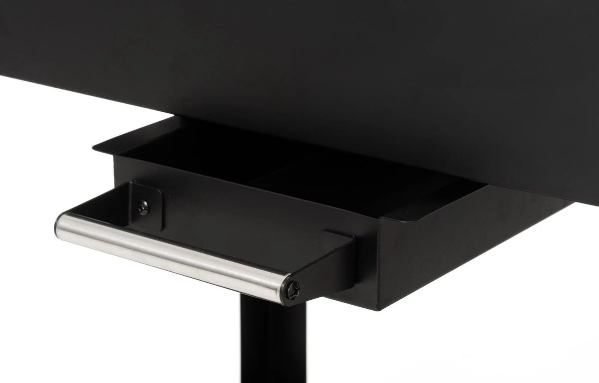 La base est en acier thermolaqué, tandis que la chambre de combustion est en acier inoxydable 304 avec un plateau en brique. La grille du gril est en acier inoxydable 201 de haute qualité. La molette de réglage avec laquelle la grille peut être ajustée en hauteur et le cadre sont en acier inoxydable 430. La charge maximale de la grille du gril est de 10 kg. Le gril extérieur a 4 roues pour un déplacement facile.
