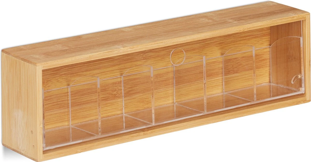 La boîte à thé en bambou est l’accessoire de cuisine idéal pour tous les amateurs de thé! Dans cette boîte de rangement pratique, vous pouvez garder tous vos thés préférés au sec et en préservant l’arôme. Les 5 compartiments spacieux de la boîte à thé peuvent contenir environ 10 sachets de thé par compartiment. Grâce au couvercle transparent, vous avez toujours un bon aperçu des thés. Le support pour sachets de thé est fixé au mur pour gagner de la place, de sorte que vous puissiez toujours accéder rapidement à votre thé. Astuce: Le coffre à thé est très joli comme cadeau si vous le remplissez de vos thés préférés.Boîte à thé en bambou 5 compartiments en détail – Dimensions totales H x L x P: environ 11,5 x 39 x 8 cm – Dimensions par compartiment H x L x D: environ 7 x 7 x 6 cm – Poids: environ 800 g – Matériel: Bamboe, acrylique – Couleur: Nature Boîte de rangement en sachets de thé pour les amateurs de thé – Assure l’ordre et la propreté dans la cuisine – 5 compartiments pour un total d’environ 50 sachets de thé – Couvercle à charnière pour un accès facile au contenu – Stockage à Droog du thé pour conserver l’arôme – A monter sur le mur pour plus d’espace dans la cuisine Contenu de la livraison – 1x boîte à thé en Bamboe – Avec matériel de montage – La Décoration n’est pas incluse dans la livraison