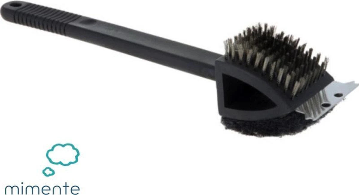 Brosse de nettoyage idéale pour votre barbecue. Une brosse en acier pour la saleté tenace. Un grattoir en fer sur le devant de la brosse. Et une éponge de l’autre côté.