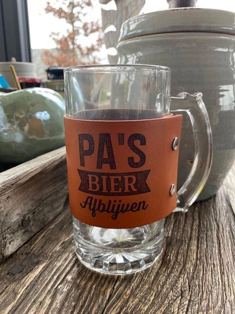 Les porte-clés, les ouvre-bouteilles et les manchons autour des mugs sont en simili cuir et les textes sont gravés au moyen d’un «marquage à chaud». Cela permet de garder les textes clairement lisibles même après une période plus longue. Les produits sont également fournis en simili cuir.