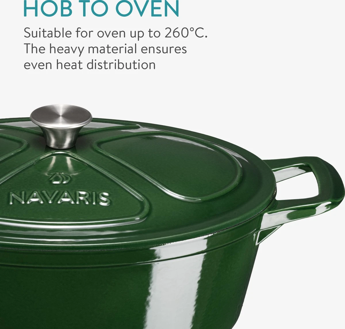 - Avec la poêle en fonte Navaris, vous pouvez cuisiner, cuire, rôtir et mijoter. Il convient à la cuisson à induction, au gaz, halogène, céramique et électrique et peut également être utilisé au four (jusqu’à 260 degrés).