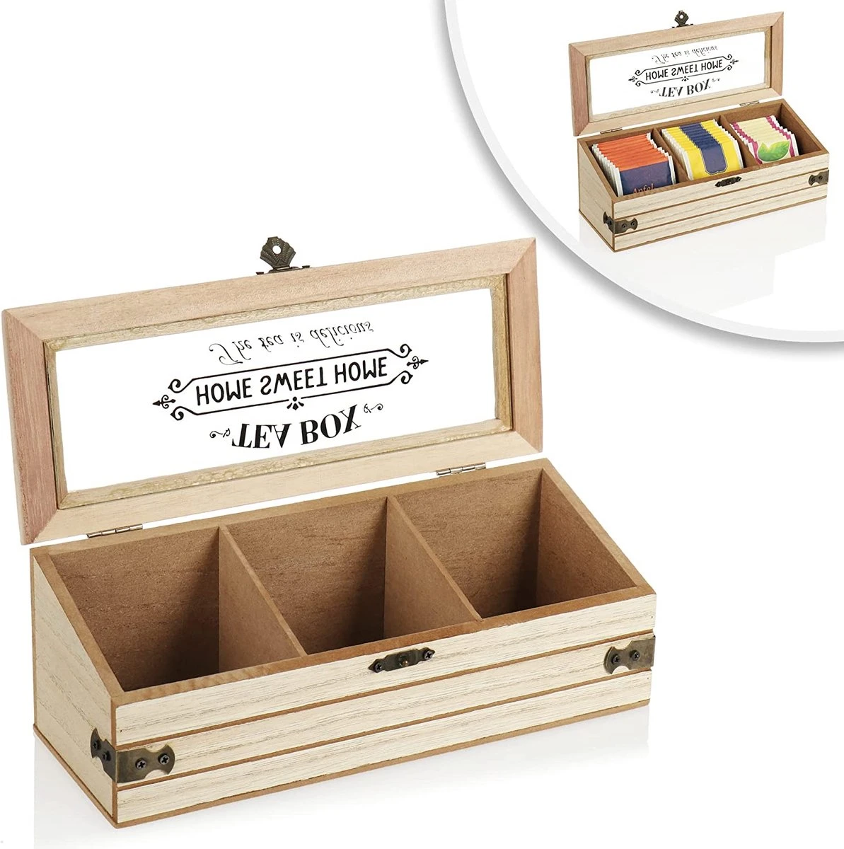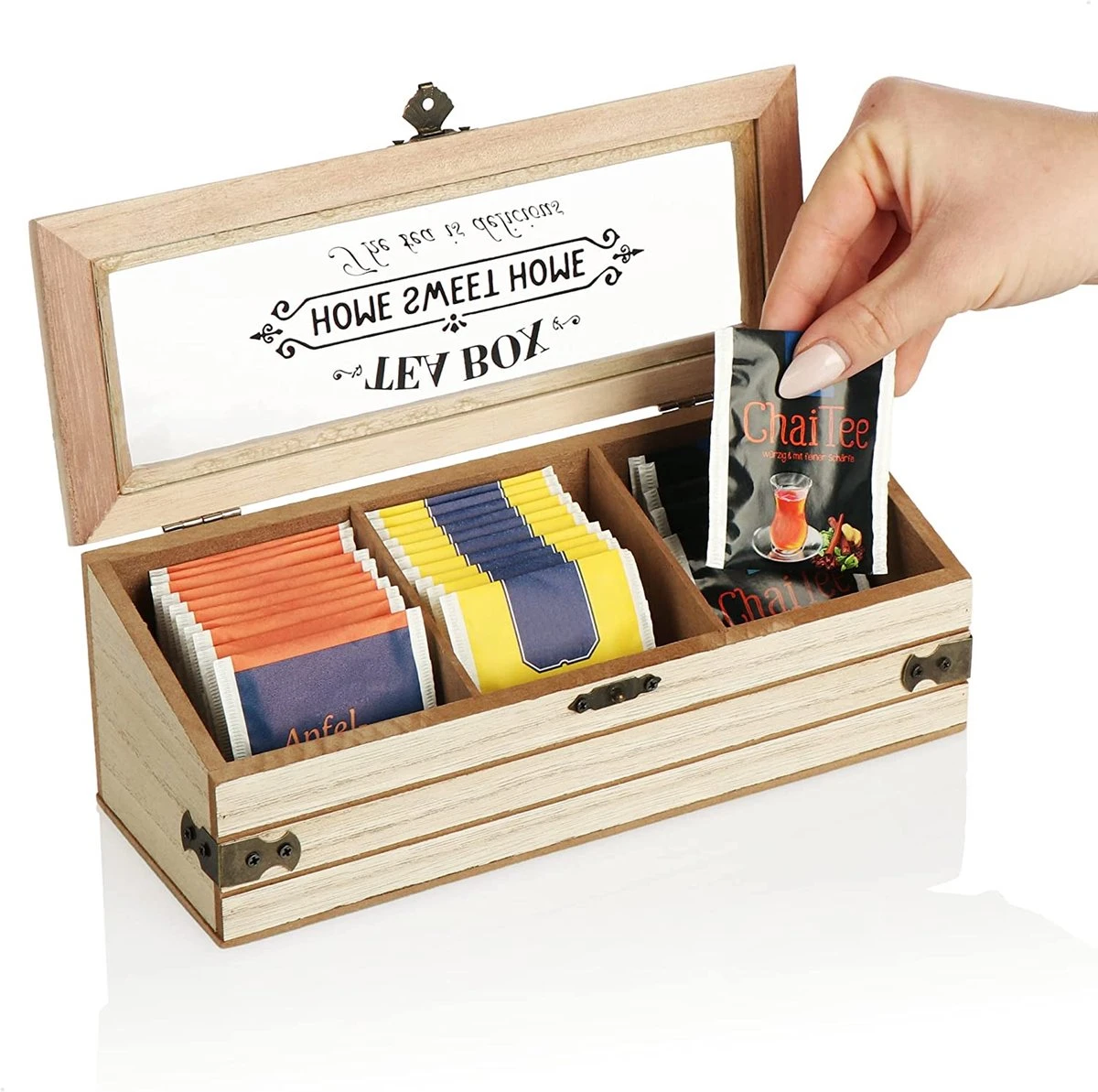 - DESIGN : la boîte à sachets de thé en bois au look vintage dispose de trois compartiments séparés et offre donc suffisamment d’espace pour plusieurs types de thé. Idéal pour les buveurs de thé !