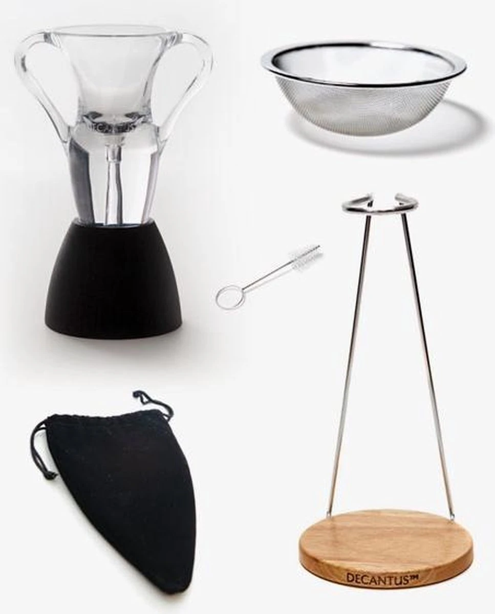 Le Decantus Connoisseur est livré avec un étui, un tamis, une brosse, un grand support pour accrocher le Decantus au-dessus du verre et un support pour l’utiliser sur une table