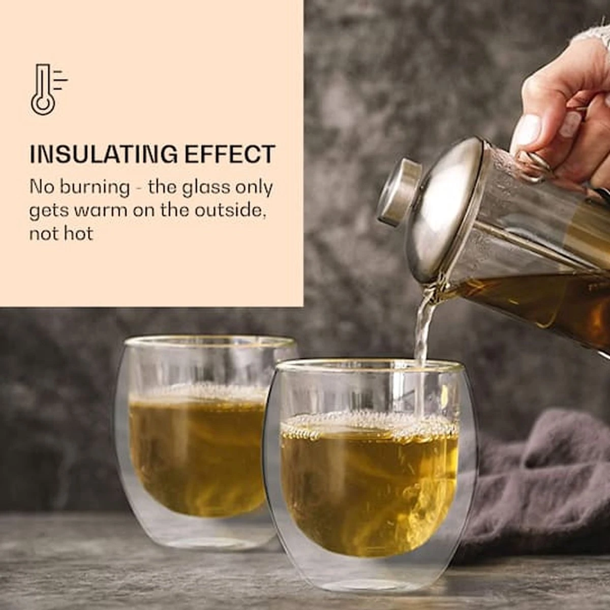 - Particularités : avec effet flottant optique, la boisson semble flotter dans le verre, avec effet isolant : pas de brûlure des doigts, le verre ne se réchauffe qu’à l’extérieur.