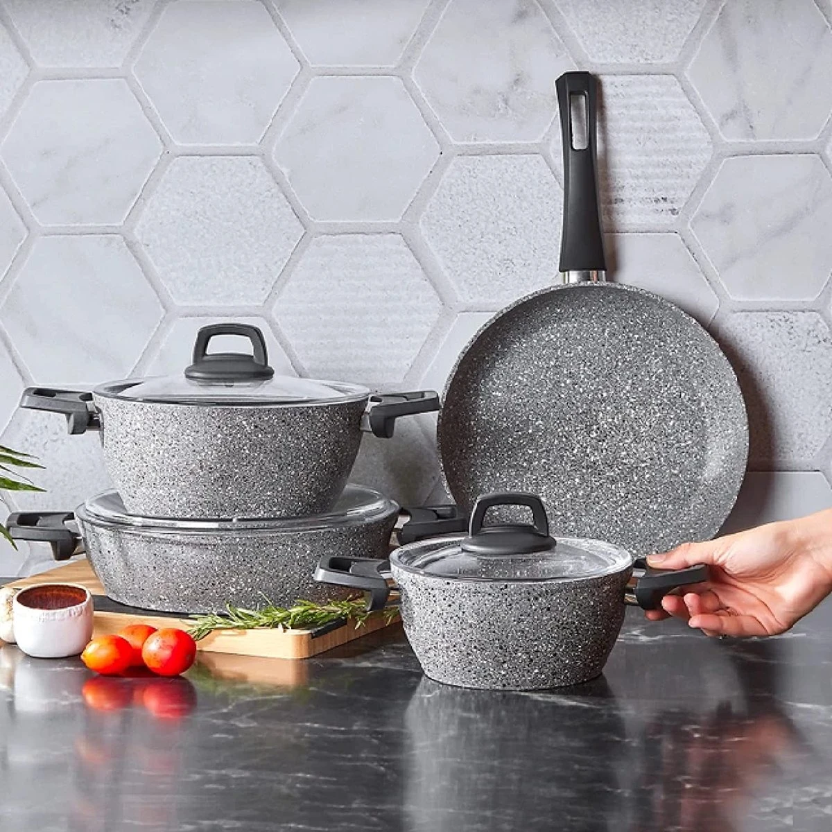 - Pourquoi le biogranit ? Grâce à sa technologie de pointe, il est extrêmement durable et les matériaux utilisés dans sa production sont certifiés et ne contiennent pas de substances nocives. Avec sa surface renforcée en granit, la poêle est extrêmement résistante aux rayures. Le matériau est anti-salissures et facile à nettoyer, car il a une fonction antiadhésive maximale. Le matériau est jusqu’à 7 fois plus résistant aux rayures que des produits similaires.