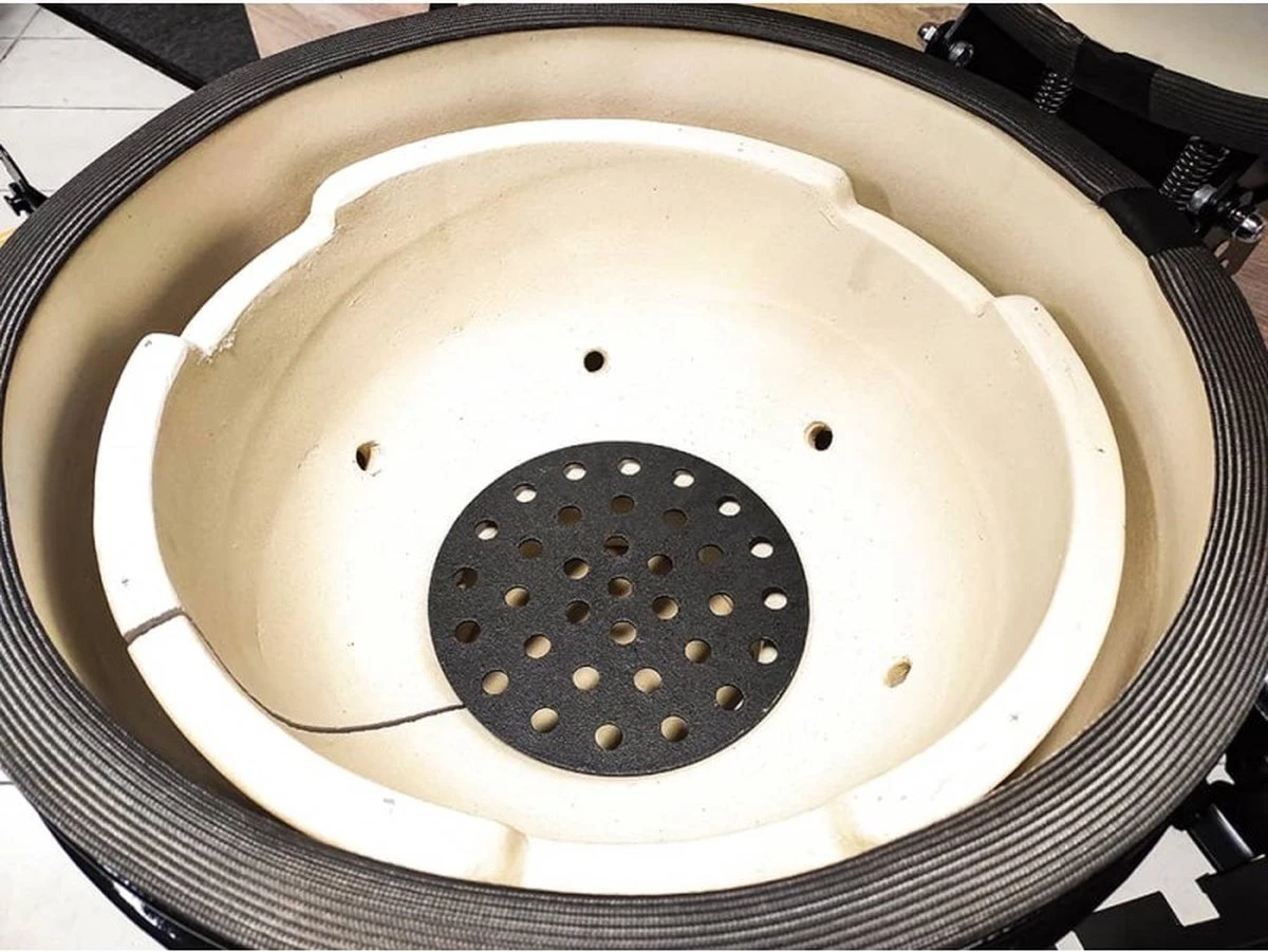 Le nouvel évent amélioré sur le dessus assure une régulation optimale de la température, même lorsque vous ouvrez votre kamado. La principale différence avec la roue de cheminée classique est que notre ventilateur a une housse de pluie. Cela empêche la pluie d’entrer et de couler sur votre nourriture ou votre charbon de bois, vous pouvez donc utiliser votre kamado même par mauvais temps.