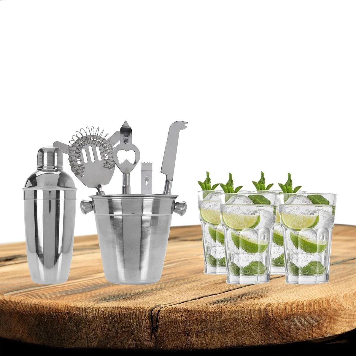 Excellent Houseware en argent 6 pièces avec 4x verres à Mojito de 410 ML. L’ensemble shaker se compose de : un shaker, un seau à glace, une pince à glace, une passoire et un ouvre-couteau. Matériau : acier inoxydable. Ne vont pas au lave-vaisselle. Les verres vont au lave-vaisselle.