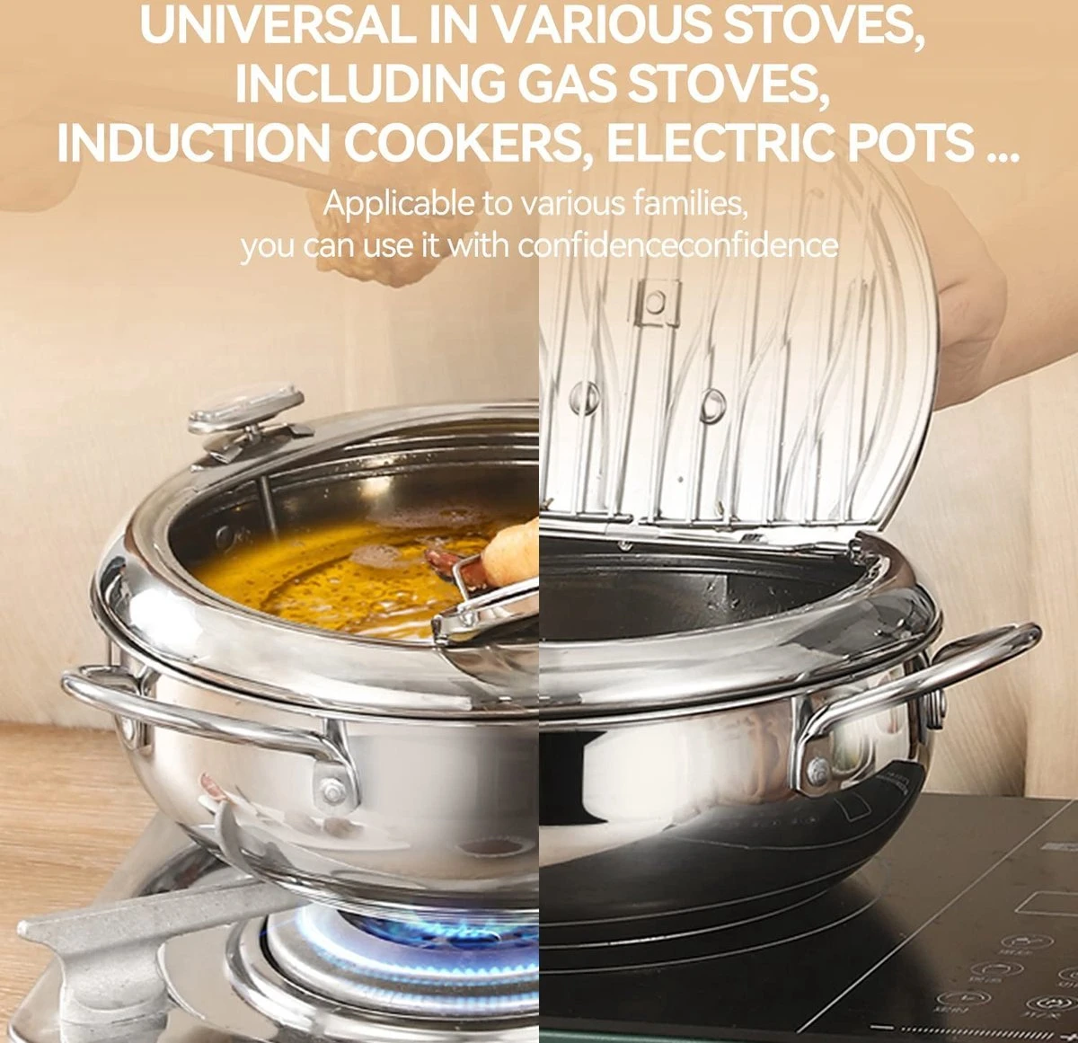 - UNIVERSELLE – Cette friteuse tempura est une poêle universelle, compatible avec tous les types de cuisinières, telles que les cuisinières à gaz, les cuisinières à induction, etc. En même temps, toute la casserole est également très portable et facile à transporter. Avec cette friteuse, vous profitez non seulement de délicieuses fritures, mais vous n’avez plus à vous soucier des problèmes de santé.