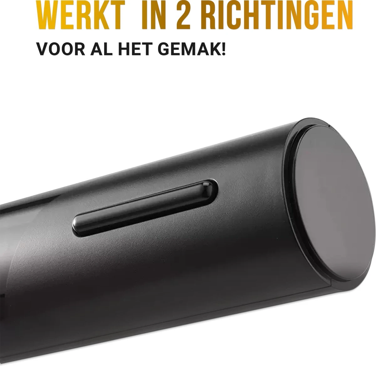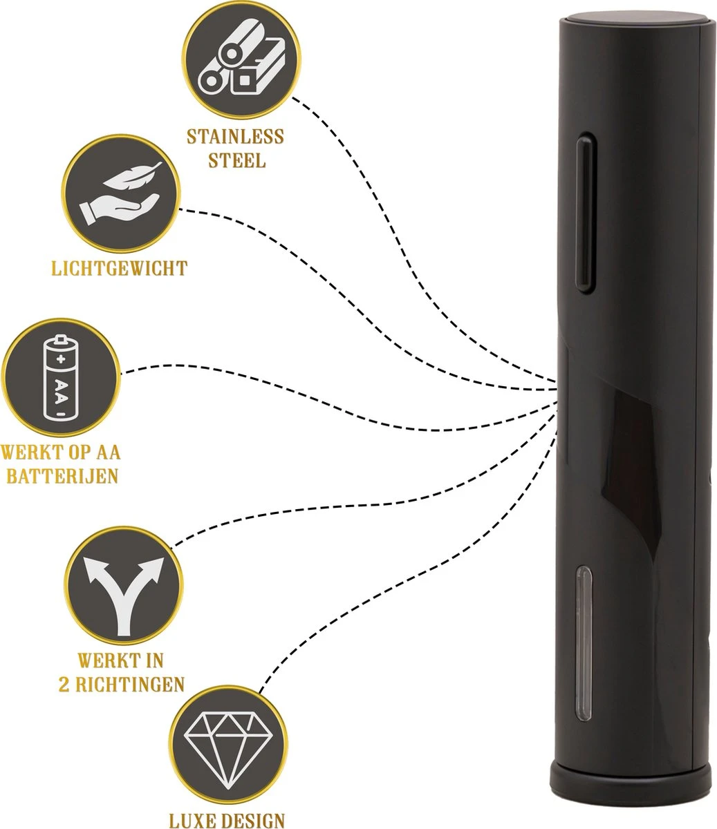 Avec cet ouvre-bouteille spécial et luxueux, vous pouvez facilement déboucher les bouteilles de vin. letire-bouchon électrique est un toutgadget pratique pour lui/elle ce qui rend la vie beaucoup plus facile. Coupe avec lecoupe-capsule fourni d’abord le papier d’aluminium de la bouteille de vin. Fixez ensuite le tire-bouchon électrique sur le dessus de la bouteille de vin. Appuyez sur le bouton du bas du tire-bouchon électrique pour ouvrir le bouchonautomatiquement de la bouteille, puis appuyez sur le bouton supérieur pour libérer le bouchon.