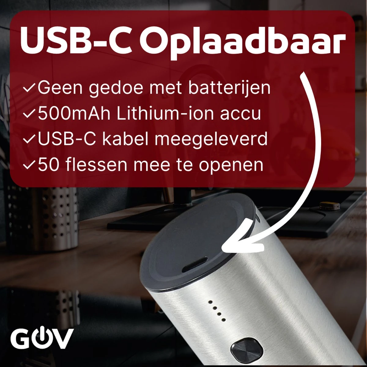 L’ouvre-bouteille électrique GOV en acier inoxydable est rechargeable, donc les tracas avec les piles ne sont plus nécessaires. Avec une batterie pleine, vous pouvez ouvrir ce décapsuleur jusqu’à 50 bouteilles !
