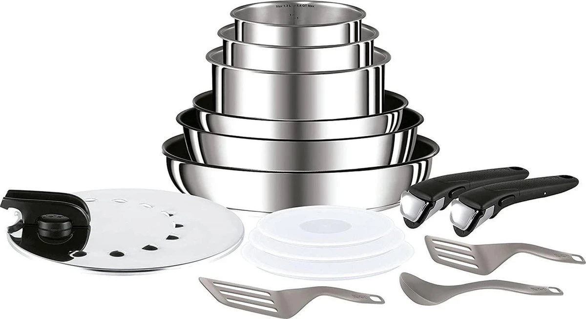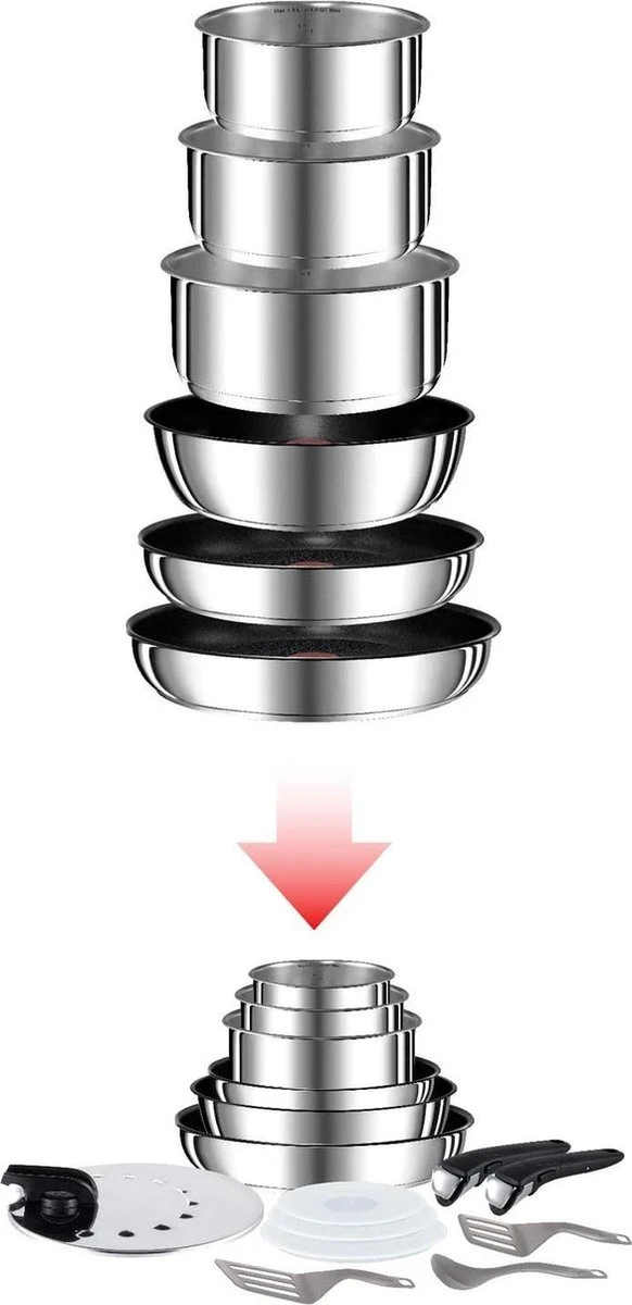 - Contenu : 2 x casseroles (22 et 26 cm), 3 x cocotte (16, 18 et 20 cm), 1 x cocotte (24 cm), 1 x couvercle en acier inoxydable (pour 20-26 cm), 3 x couvercle en plastique ( 16, 18 et 20 cm), 2 x poignées amovibles en thermoplastique Ingenio 5, 2 x spatule à friture, 1 x tache de pollen.