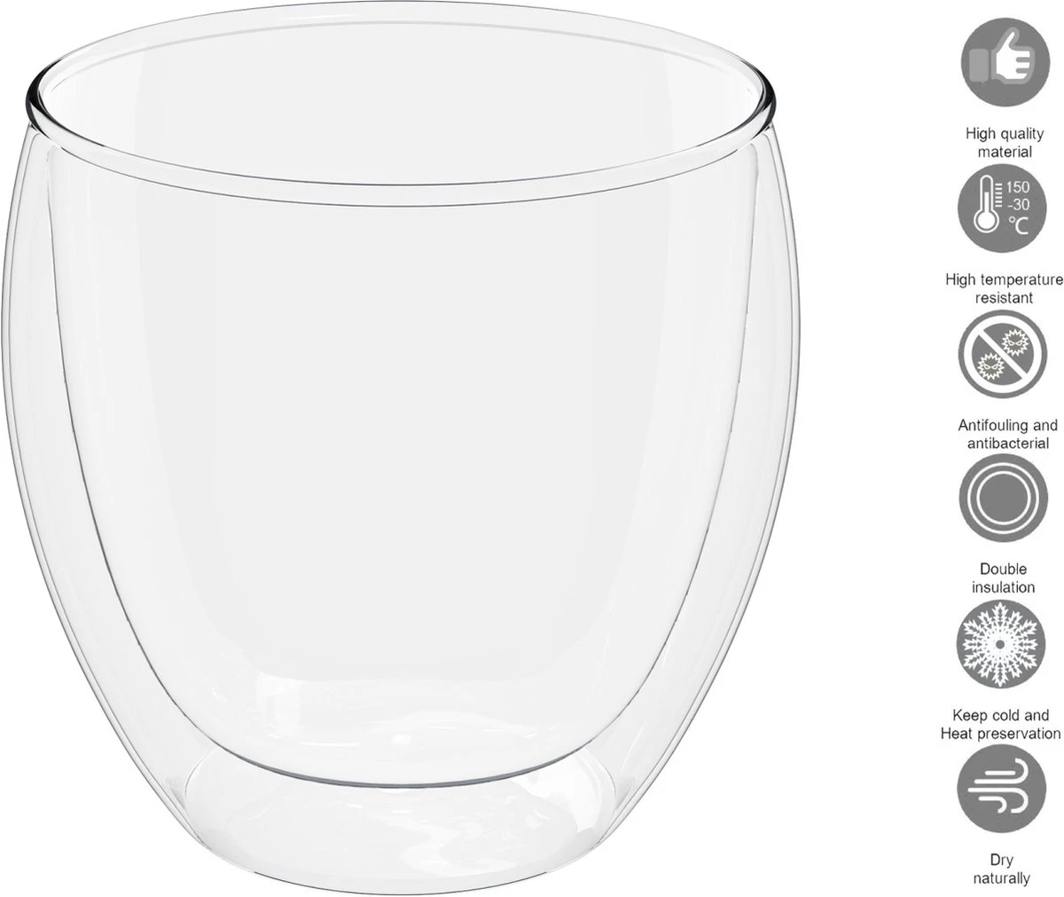 Grâce aux propriétés isolantes, le verre thermo ne chauffe pas à l’extérieur, de sorte que vous ne vous brûlez pas les doigts en buvant.