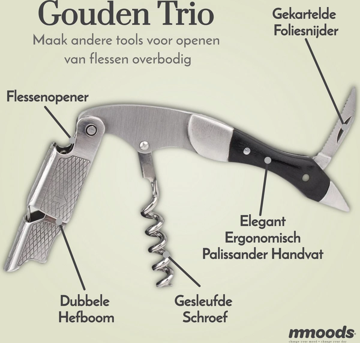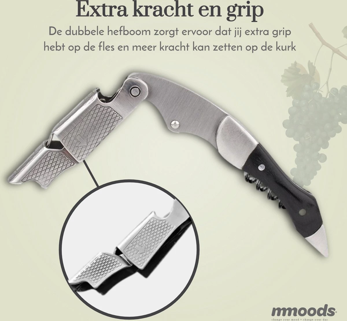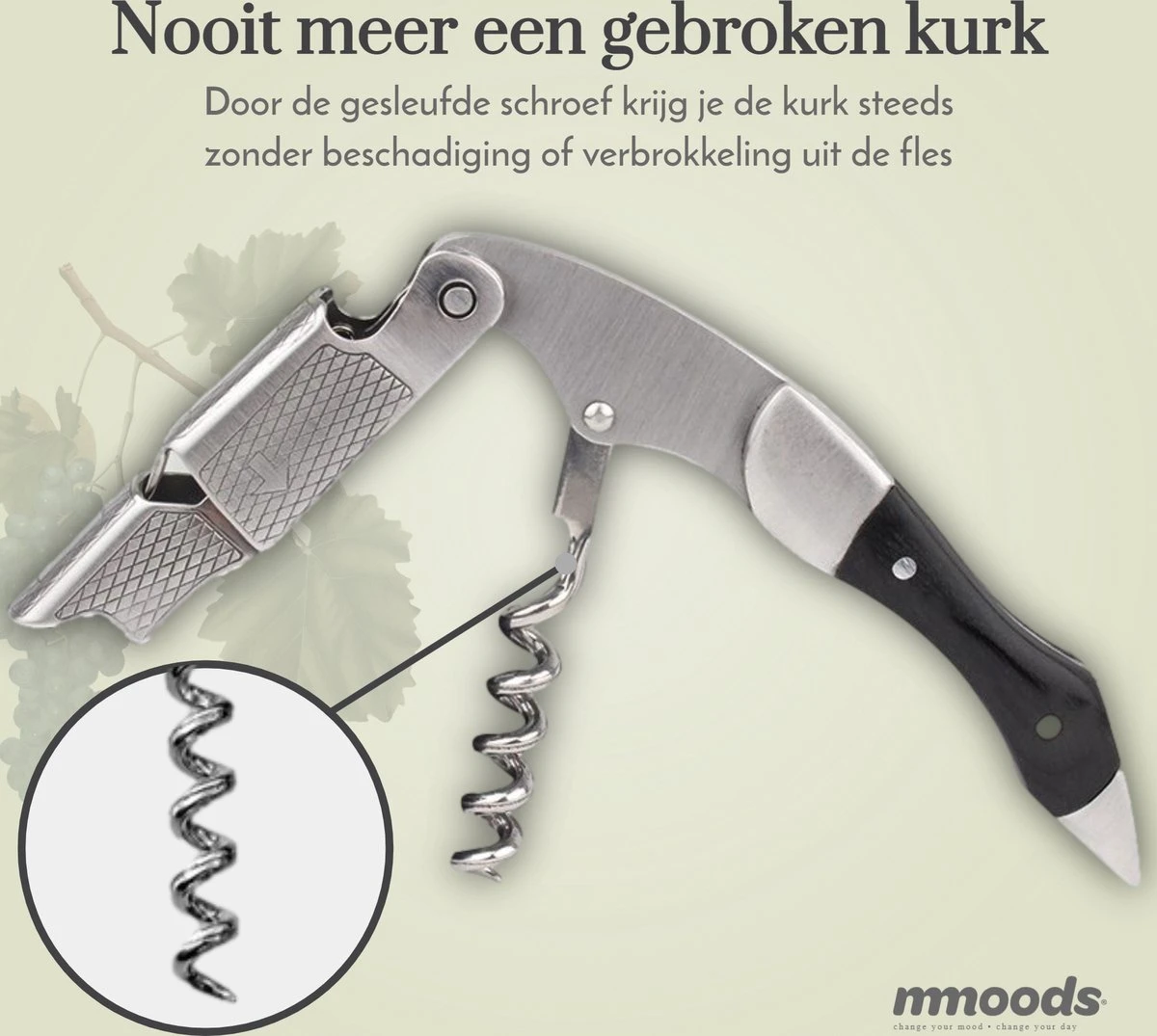 D’autres outils pour ouvrir les bouteilles de vin sont inutiles une fois que vous avez l’ouvre-bouteille Mmoods. Celui-ci contient tout pour le faire le plus facilement et le plus élégamment possible :