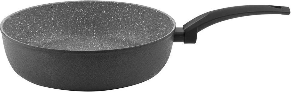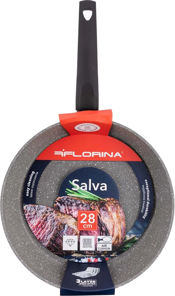 La poêle Salva en aluminium a un revêtement en céramique à 3 couches qui résiste aux températures élevées, de sorte qu’aucune déformation ne peut avoir lieu. La technologie du coussin Air vous permet de cuisiner avec peu d’huile ou de graisse et ne colle pas rapidement au fond. Le manche est en bakélite avec un revêtement soft au toucher agréable à utiliser