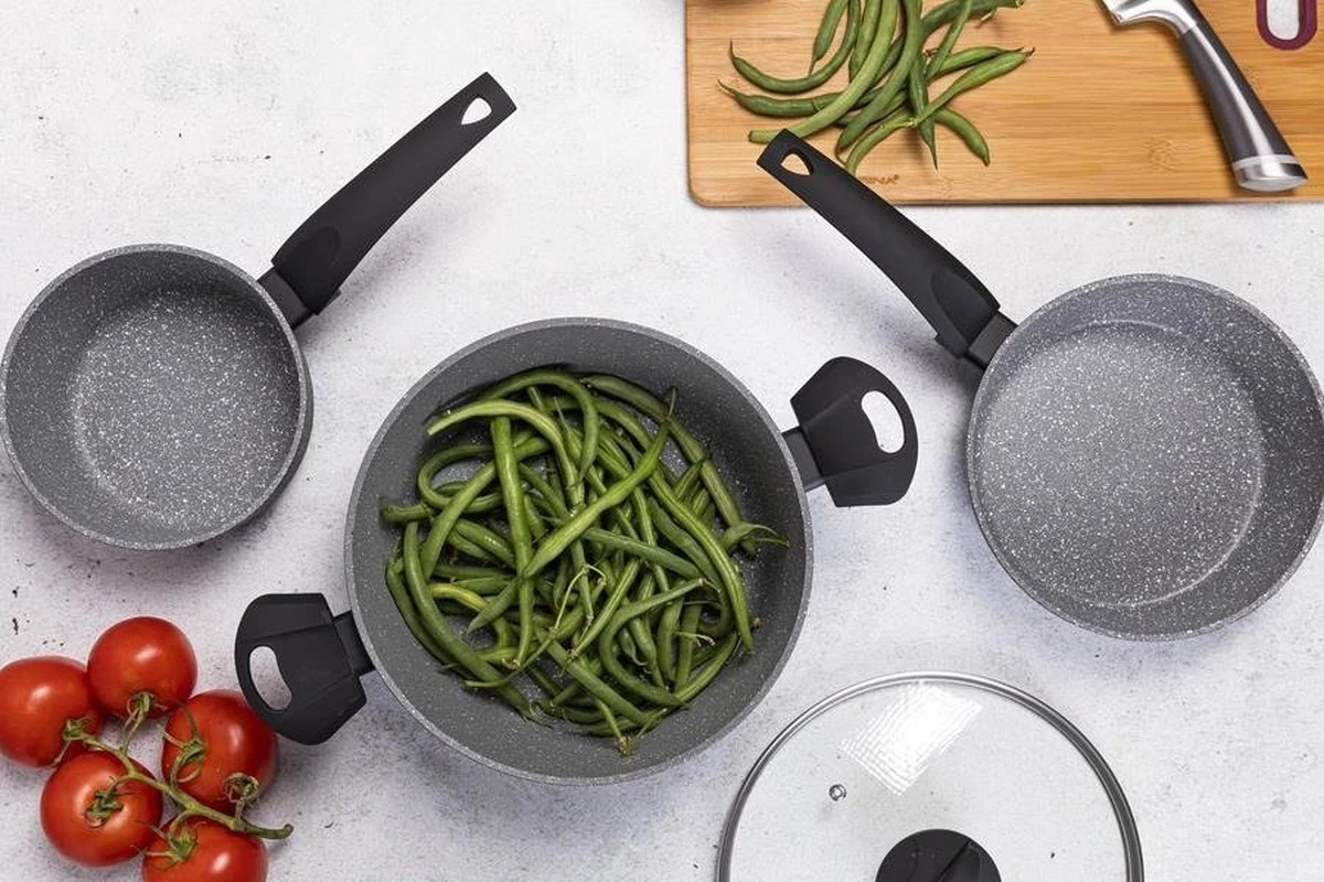 Découvrez toute la collection de poêles Onyx pour compléter votre ensemble de poêles. Cet ensemble de batterie de cuisine donne à votre cuisine un look unique. Les poêles Salva conviennent à toutes les sources de chaleur, que vous cuisiniez au gaz ou à l’électricité, tout est possible.