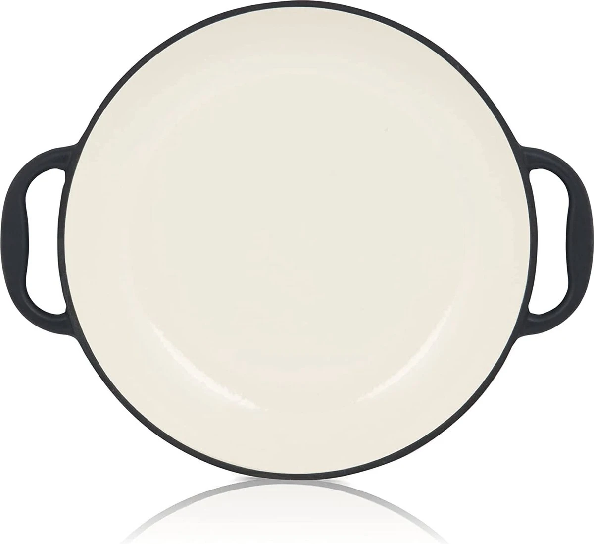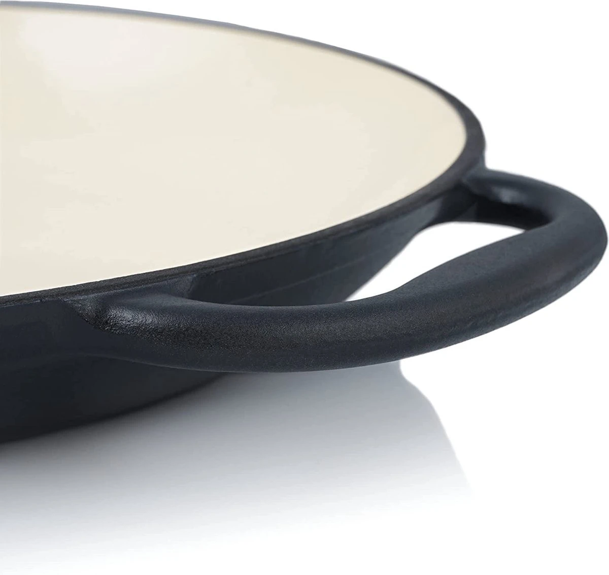 - Utilisation : La poêle à farine en fonte émaillée est idéale pour préparer la paella espagnole, pour faire frire du poisson, de la viande ou des fruits de mer. Convient également pour faire mijoter des légumes et de nombreux autres plats. La poêle émaillée a une bonne conductivité thermique et répartit la chaleur uniformément sur le rôti.