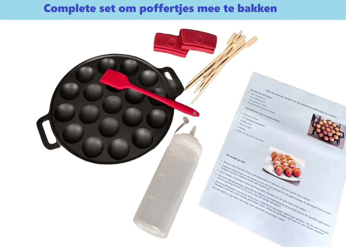 Vous obtenez une grande bouteille doseuse, une brosse à pâtisserie et des poignées en silicone. Aussi des bâtons de bambou avec lesquels vous pouvez facilement tourner les poffertjes. Et bien sûr, une description claire et détaillée et des recettes pour que vous profitiez de la cuisson des poffertjes les plus délicieux.