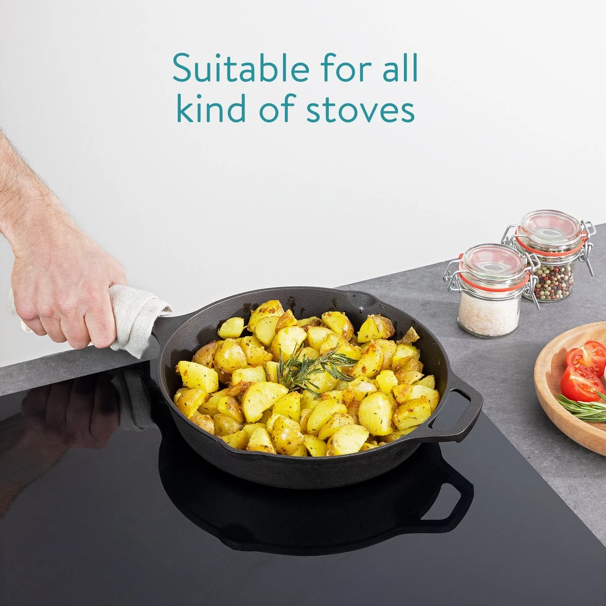 - Avec la poêle en fonte Navaris, vous pouvez cuire, rôtir et mijoter ce que vous voulez. Il convient à la cuisson à induction, au gaz et à la vitrocéramique ainsi qu’au four, au barbecue et au feu ouvert.
