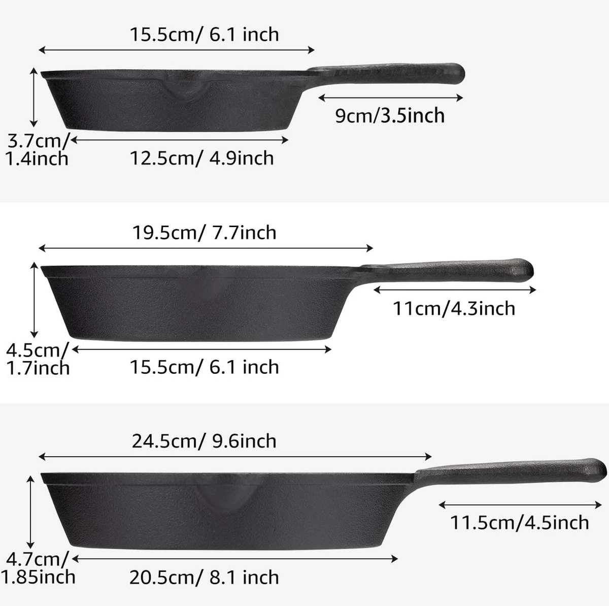 - Ensemble de 3 poêles à griller : taille S avec un diamètre intérieur de 12,5 cm, diamètre extérieur 15,5 cm, taille M avec un diamètre intérieur de 15,5 cm, diamètre extérieur 19,5 cm et taille L avec un diamètre intérieur de 20,5 cm, diamètre extérieur 24,5 cm. Différentes tailles répondent à différentes exigences
