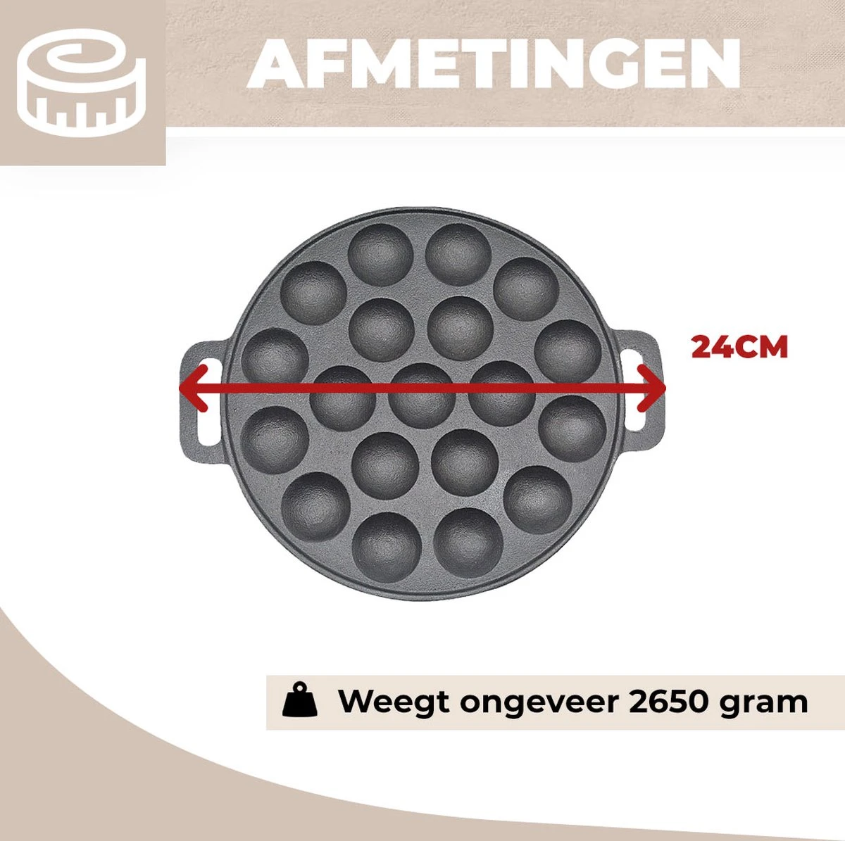 19 poffertjes peuvent être cuits à la fois. Les poffertjes mesurent environ 4 centimètres. La bonne chose à propos de cette casserole est que la chaleur est uniformément répartie, de sorte que tous les poffertjes sont également cuits en même temps. Cela vous permet de déguster immédiatement après la cuisson!