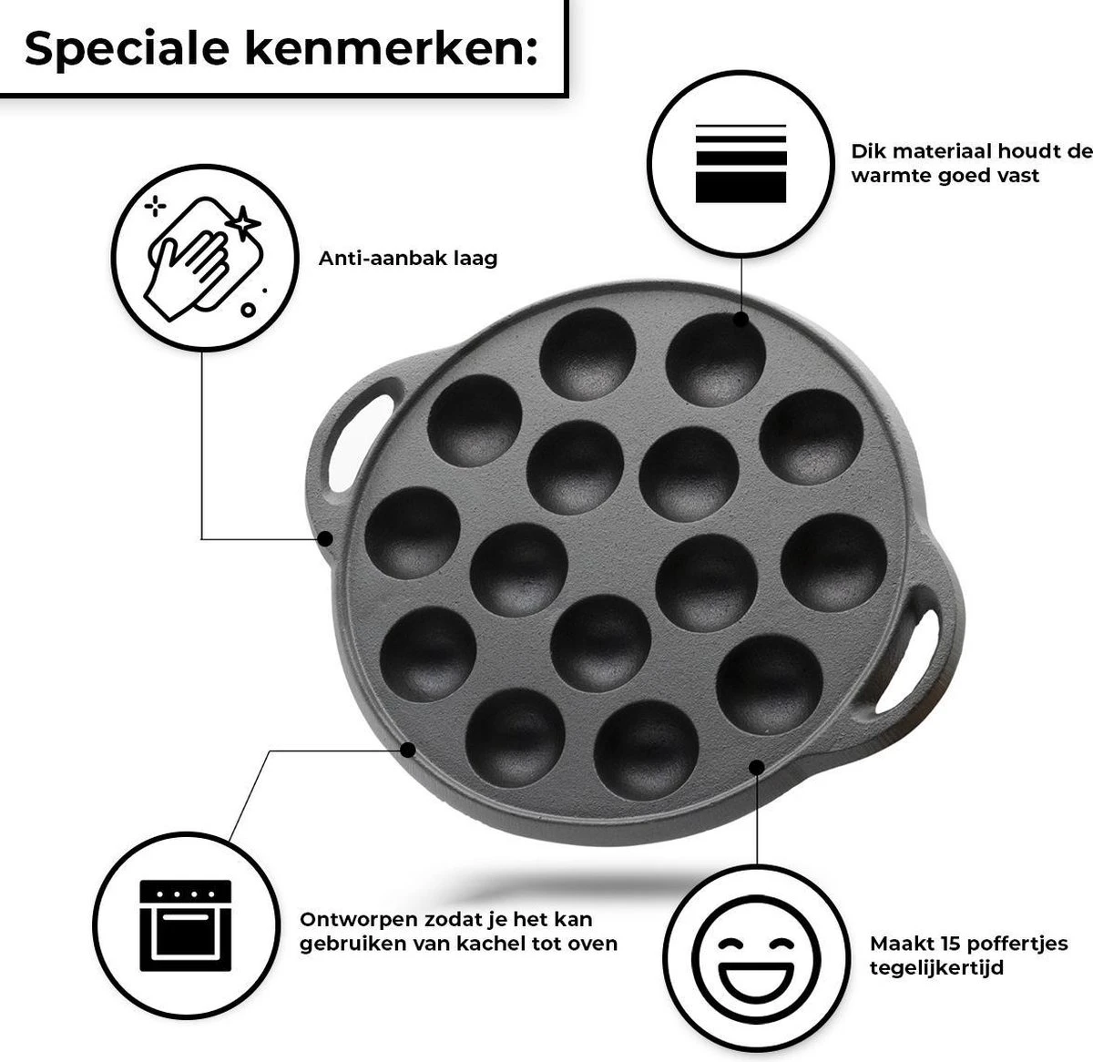 La casserole est en fonte, très facile à nettoyer après utilisation. Les poffertjes ne collent pas non plus à la casserole après graissage ou pulvérisation. Il va au lave-vaisselle, mais peut bien sûr également être lavé à la main.