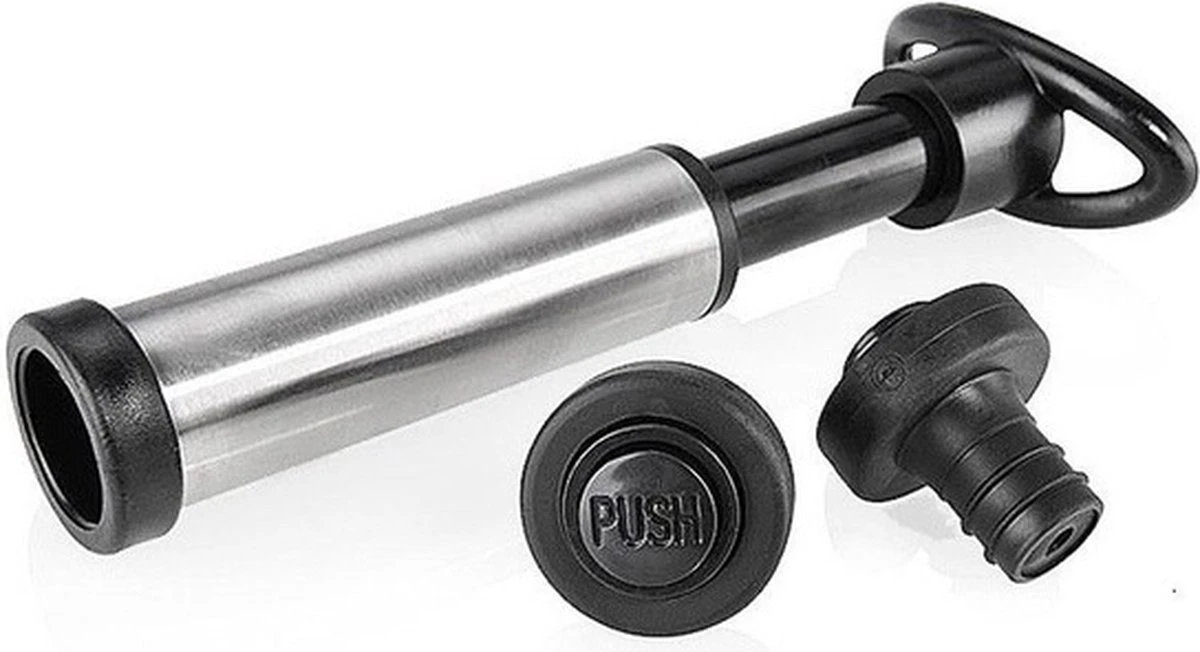 Pompe à vide pour bouteilles de vin Cuisine Elegance avec 2 bouchons en plastique et 2 becs verseurs. Les restes de vin restent savoureux et riches en arômes plus longtemps en fermant la bouteille hermétiquement avec cette pompe à vin sous vide. Mode d’emploi: mettre d’abord un bouchon sur le flacon. Ensuite, placez la pompe dessus et déplacez la poignée de haut en bas plusieurs fois. Lorsque vous commencez à ressentir une résistance, l’air a complètement disparu du flacon et vous pouvez retirer la pompe du bouchon. Taille: environ 8,5 x 3,5 x 15 cm.
