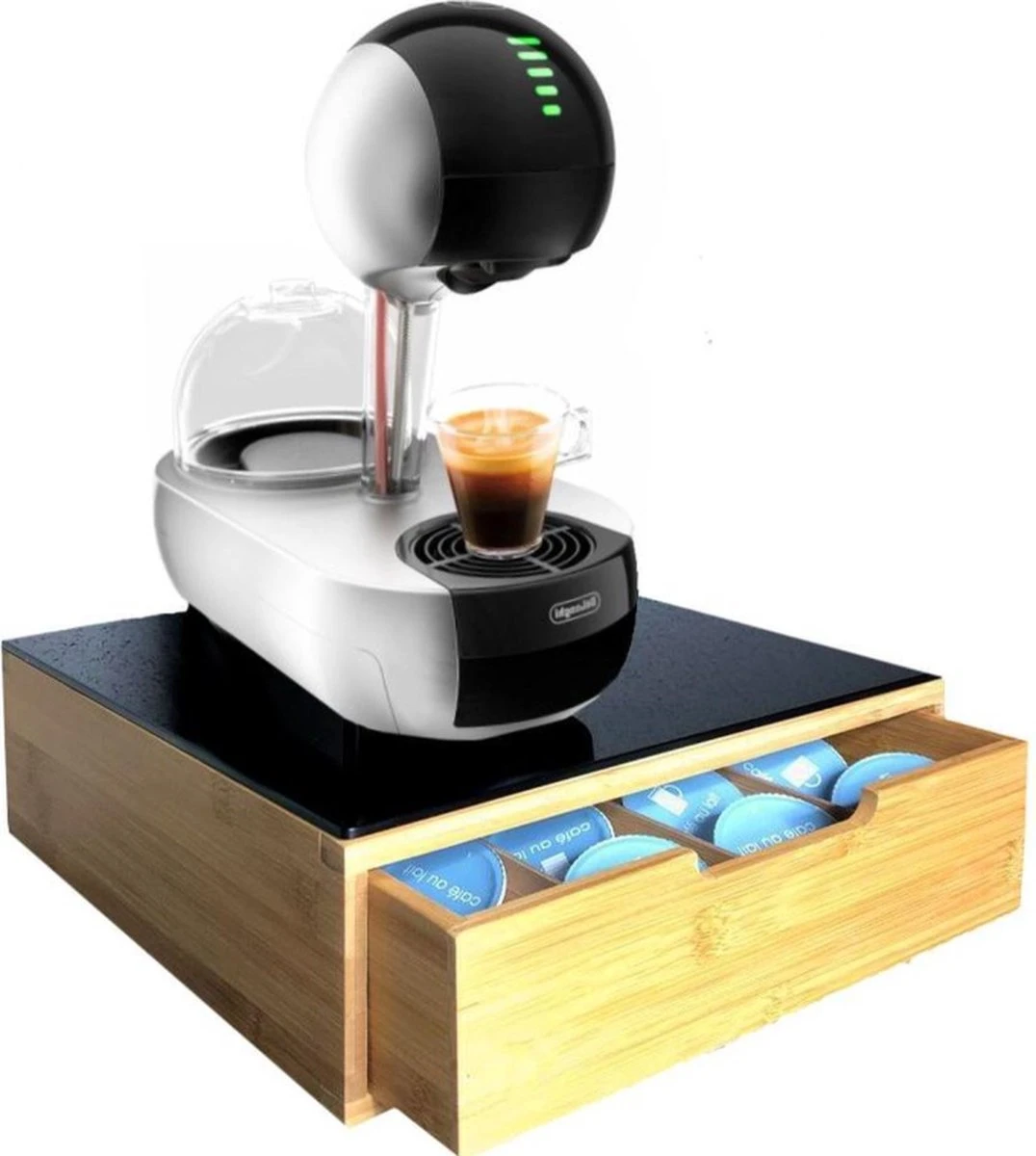 Créez un joli coin café en plaçant votre machine à café préférée sur le dessus du tiroir. Le tiroir à capsules comporte 4 compartiments séparés dans lesquels les capsules de café s’insèrent parfaitement.
