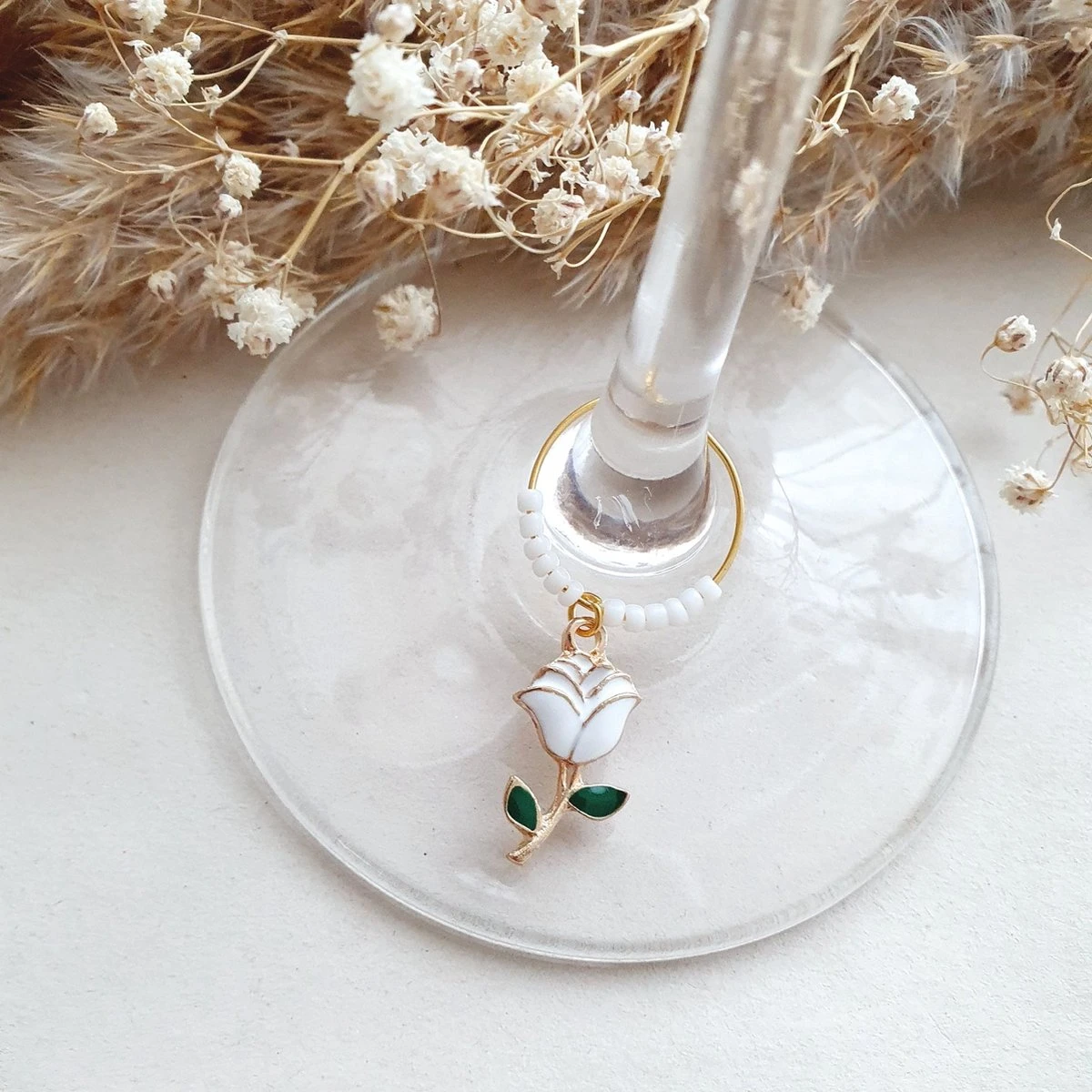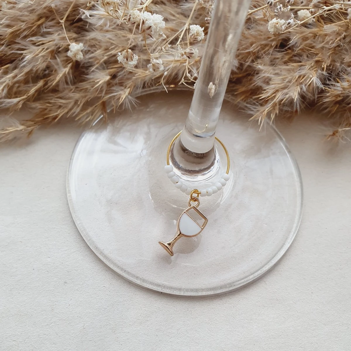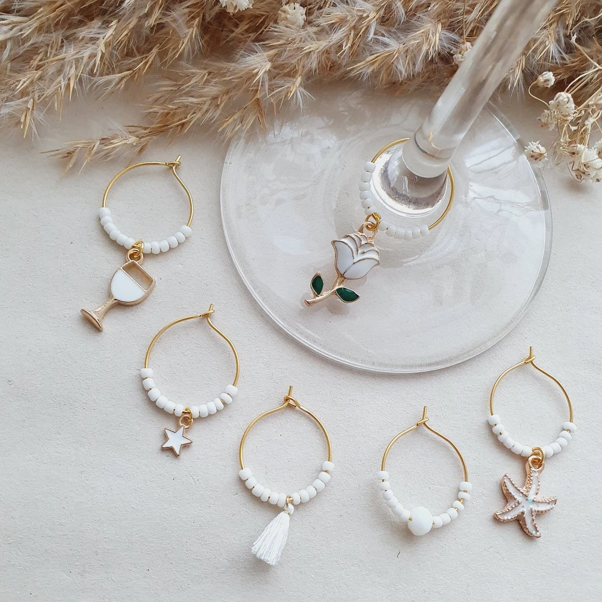 Super beaux anneaux de verre à vin de couleur blanche. Joliment mélangé avec divers charmes, afin que chacun puisse choisir son eigen anneau de verre à vin. Total 6 pièces!