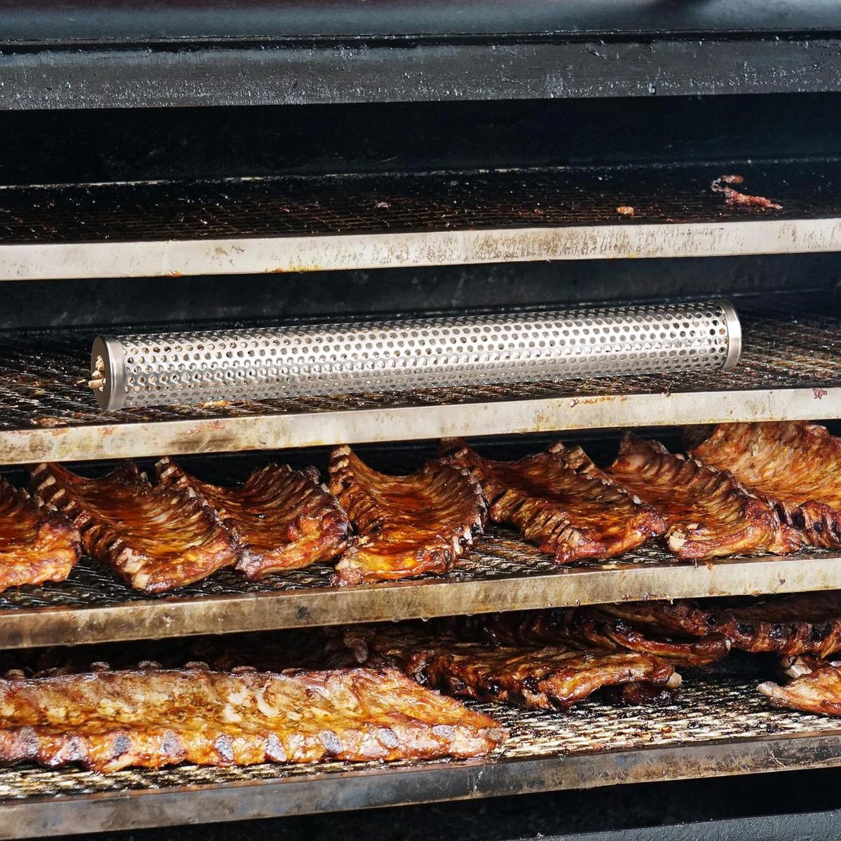 Quand la bouche a déjà l’eau, quand vous pensez au bon goût, vous vous amuserez beaucoup avec le bar à fumée en acier inoxydable. Son utilisation est très simple: placez le tube de fumage horizontalement sur le barbecue. Ensuite, remplissez-le de copeaux de fumée sur des granulés puis allumez-le. Les nombreux trous garantissent que la fumée est uniformément répartie dans le gril – c’est un net avantage par rapport aux fumoirs. Un sac de transport pratique est inclus dans la livraison pour vous permettre d’emporter facilement l’accessoire du gril avec vous. Bar à fumée en acier inoxydable en détail – Dimensions H x P: environ 30 x 3,8 cm – Dimensions de l’ouverture: environ 1,6 et 2,2 cm – Matériau: acier inoxydable – Poids: environ 85 g Tube fumoir pour un goût délicieux – Griller la viande avec savourez une saveur fumée savoureuse – Convient pour un barbecue à gaz, à boules ou à charbon de bois – Répartition uniforme de la fumée – Avec sac de rangement Contenu de la livraison – 1 x tige à fumée – 1 x sac – La décoration n’est pas incluse dans la livraison
