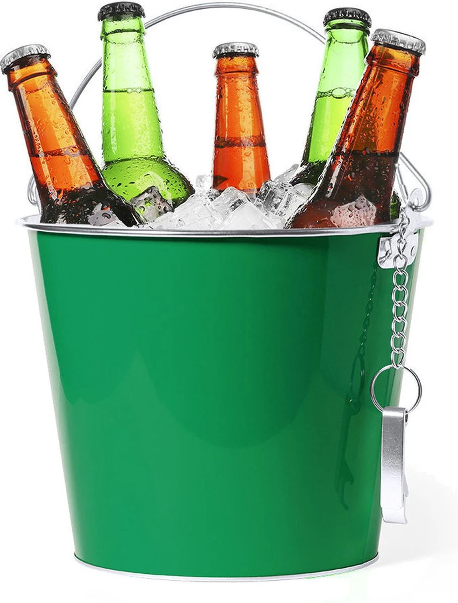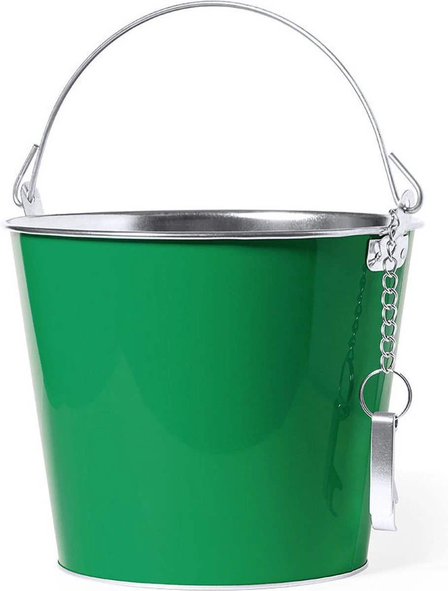 Seau à glace/seau à bière vert. Ce refroidisseur de boissons est doté d’une poignée pratique et d’un ouvre-bouteille en aluminium avec chaîne en finition argentée. Le seau de refroidissement est galvanisé à l’intérieur. Dimensions : environ D22,5 x 18,5 cm. Contenu: environ 6 litres. Matériau : métal.