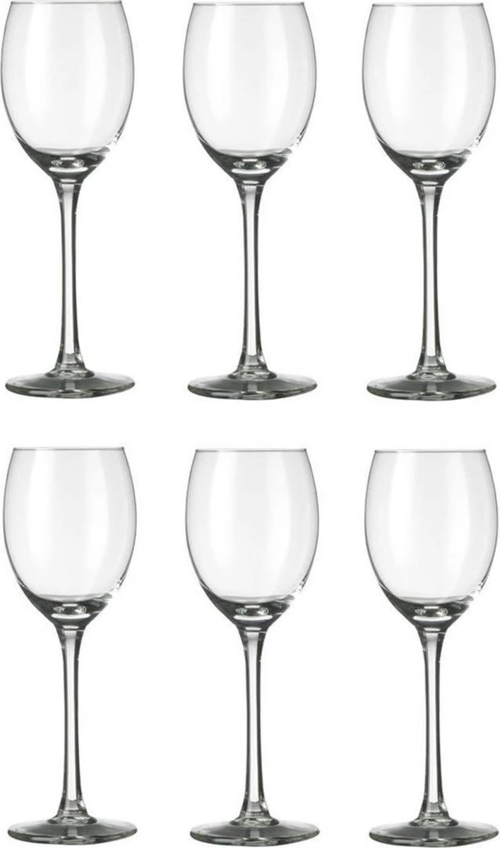 Set de 12 verres à vin transparents. Contenu: 250 ml (25cl). Matière : verre. Taille : diamètre du haut : 7 cm. Diamètre milieu : 7 cm. Diamètre bas : 7 cm. Hauteur : 20,4 cm. Convient pour: lave-vaisselle. Boissons appropriées: vin blanc. Pour plus de verres dans cette série, recherchez : Plaza.