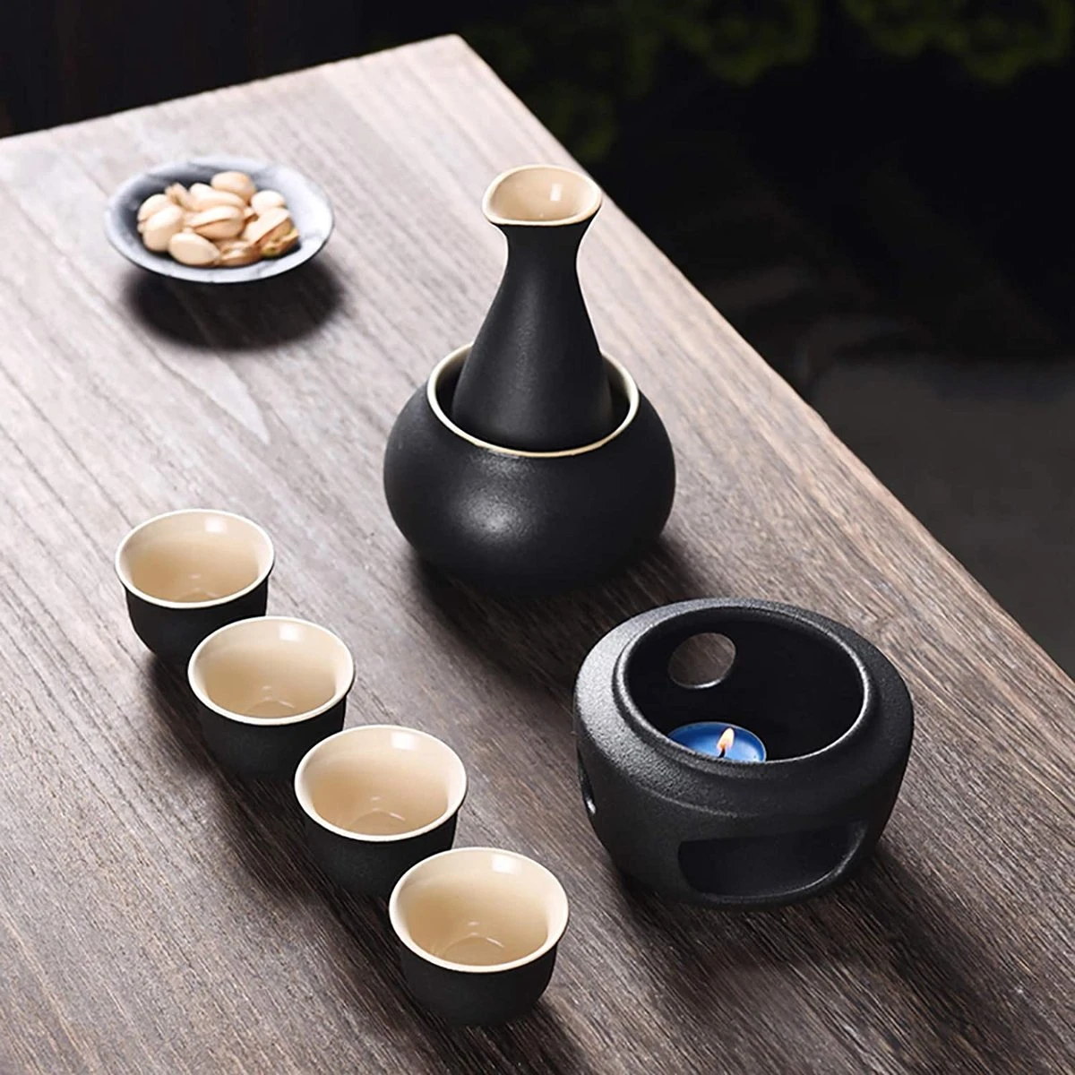 - Service à saké en céramique 7 pièces : le colis comprend 1 réchaud à bougie, 1 bol chauffant, 1 pot à saké et 4 tasses à saké (ce produit ne contient pas de bougies).