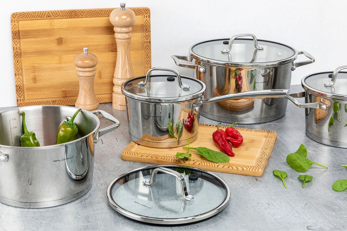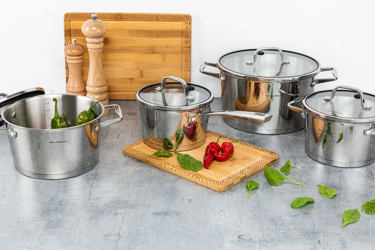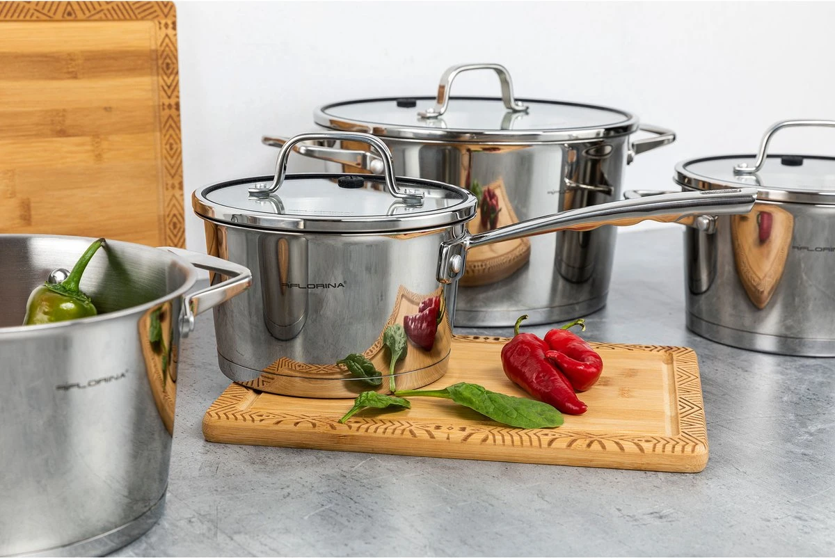 Les casseroles Florina Professional sont fabriquées en acier inoxydable de la plus haute qualité avec une épaisseur de paroi de 0 mm et un fond multicouche qui absorbe parfaitement la chaleur. Un avantage supplémentaire des casseroles sont les couvercles transparents qui vous permettent de visualiser l’état de cuisson des plats. Les parois épaisses de la casserole gardent les aliments au chaud plus longtemps après la cuisson. Les poignées robustes en acier inoxydable ne chauffent pas, vous pouvez donc déplacer les casseroles rapidement et confortablement.