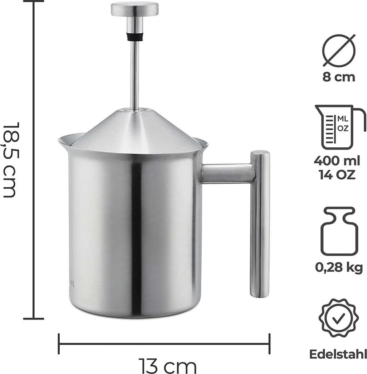 ✅ Groot volume de 400 ml avec échelle de mesure – pour plusieurs tasses ou une grande tasse de lait mousseux. Mesure facile avec échelle intégrée. Ainsi, jusqu’à 120 ml de lait liquide peuvent être moussés pour jusqu’à 2-3 cappuccinos.