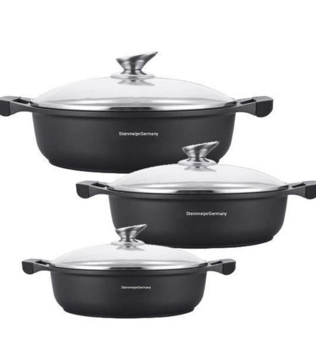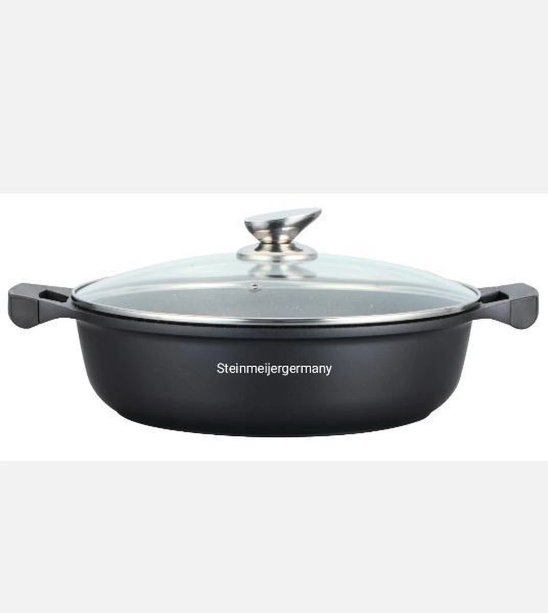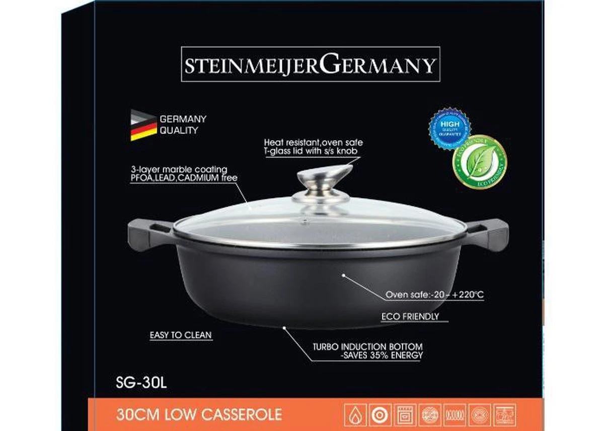 Poêle à frire 32 cm revêtement en marbre Merk: Steinmeijergermany Couleur: Zwart Contenu: – Poêle à frire – Couvercle en Verres Taille: 32 cm de diamètre (dessus de la poêle) Capacité: 6 litres Quand utilisez-vous une poêle? Cette casserole convient pour préparer un repas ou rôtir de la viande pour un grand groupe de personnes. Très grande casserole. Ne peut être utilisé que sur un très gros brûleur ou un brûleur de wok. Revêtement en marbre: Grâce au revêtement en marbre de cette poêle, votre viande ne collera pas. Cette couche est également réalisée sans PFOA. Facile à nettoyer. Forme: La marmite / poêle a une forme ronde et un rebord haut. Ces poêles à frire sont disponibles en différentes tailles, de 30 cm à la plus grande poêle. Avantages: Ces belles poêles à frire sont beaucoup plus durables, elles peuvent mieux tolérer la chaleur, donc elles durent plus longtemps. La cuisson avec cette casserole est possible sans beurre ni huile, en raison de la couche de marbre lisse, rien ne colle et la casserole est très facile à nettoyer. De plus, aucune substance toxique n’est libérée, comme c’est le cas avec les casseroles en téflon. Un autre avantage du revêtement par rapport au revêtement céramique est que la couche de marbre est noire de sorte qu’elle se décolore moins rapidement