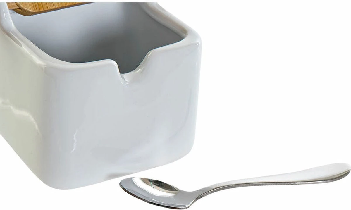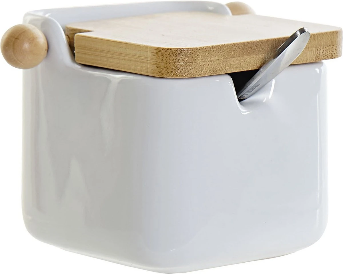 Sucrier / sucrier en céramique blanche avec cuillère et couvercle. Taille : 8 x 8 x 10,5 cm.