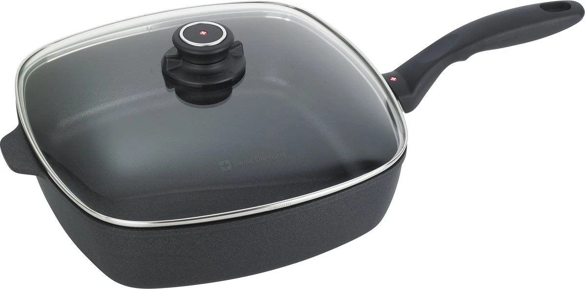 La sauteuse Swiss Diamond , idéale pour vos viandes, légumes et sauces préférés, est un complément nécessaire à toute cuisine. La poêle contient désormais 20 % de cristaux de diamant en plus grâce au nouveau revêtement Swiss Diamond XD, est plus durable et possède des propriétés avancées de libération des aliments. La casserole elle-même est carrée, mais la base est ronde de sorte que la casserole s’adapte sur un œil de plaque à induction typique. La construction en aluminium moulé sous pression de haute qualité assure une répartition uniforme de la chaleur dans toute la casserole.