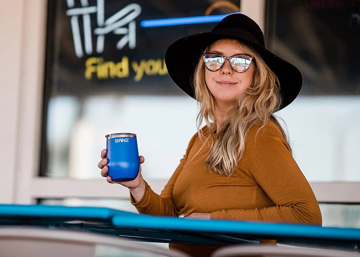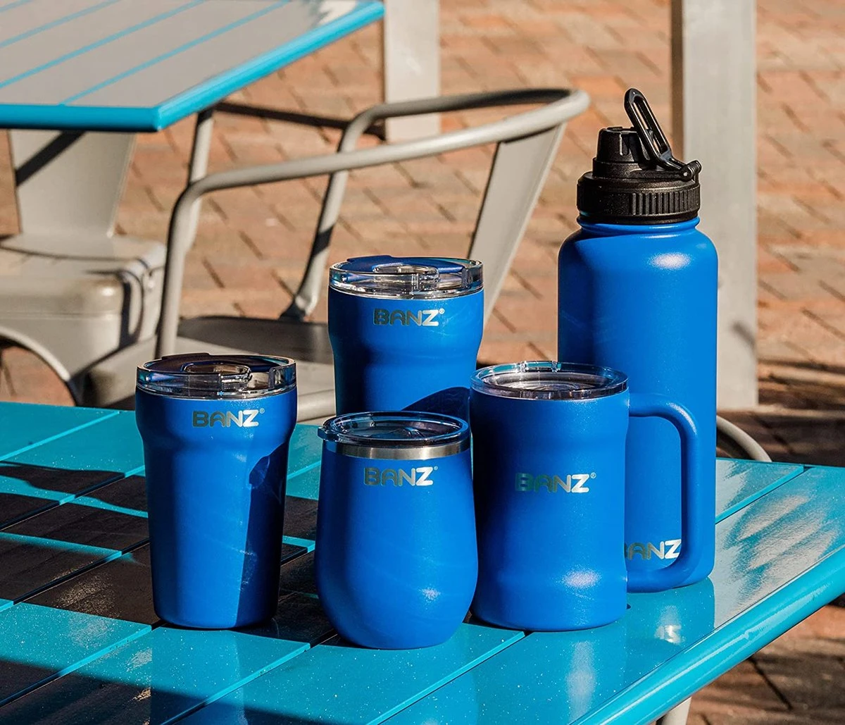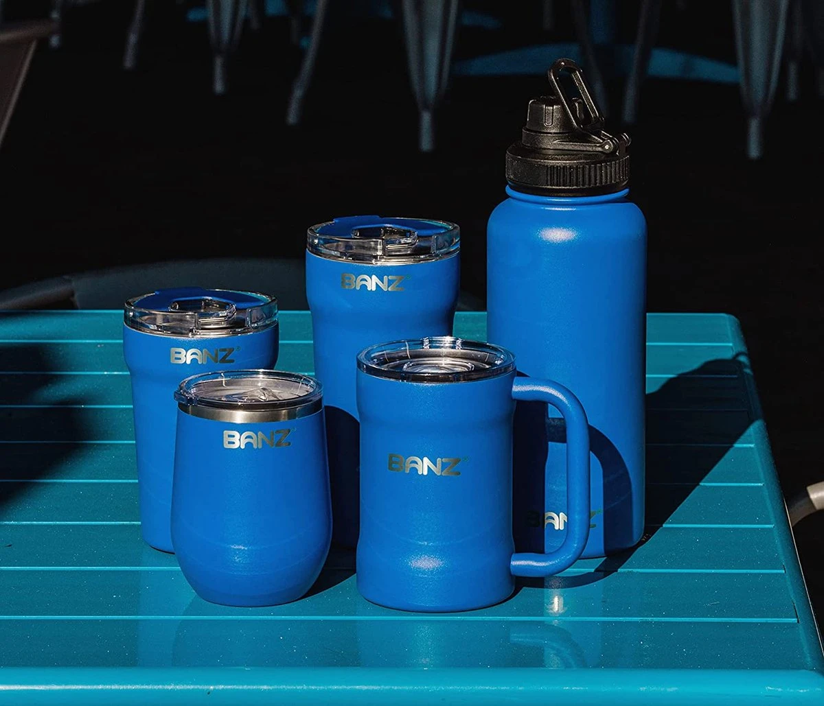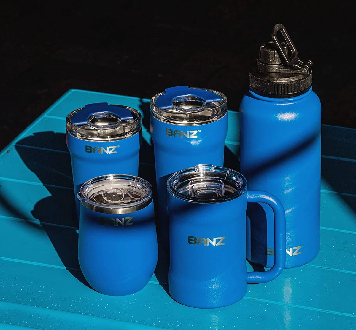 - Avec finition enduite de poudre Easy Grip et le couvercle BANZ EASY SIP et résistant aux gouttes.