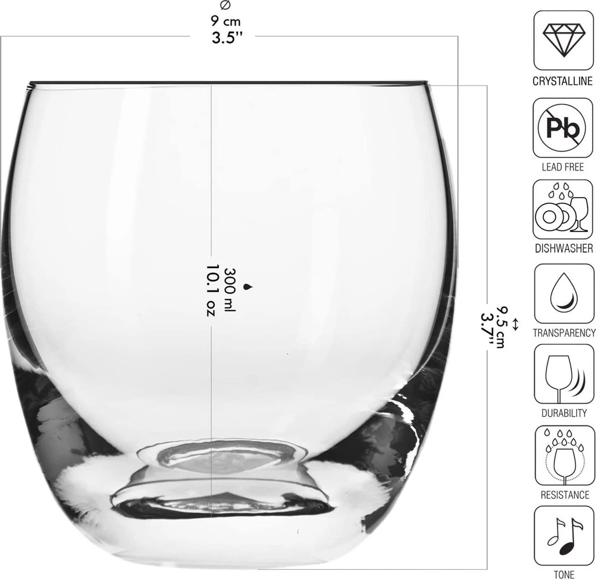 - Verre cristallin : grâce au verre cristallin, l’ensemble de verres est non seulement très durable et résistant aux dommages mécaniques, mais il est également magnifique. L’ensemble va au lave-vaisselle.