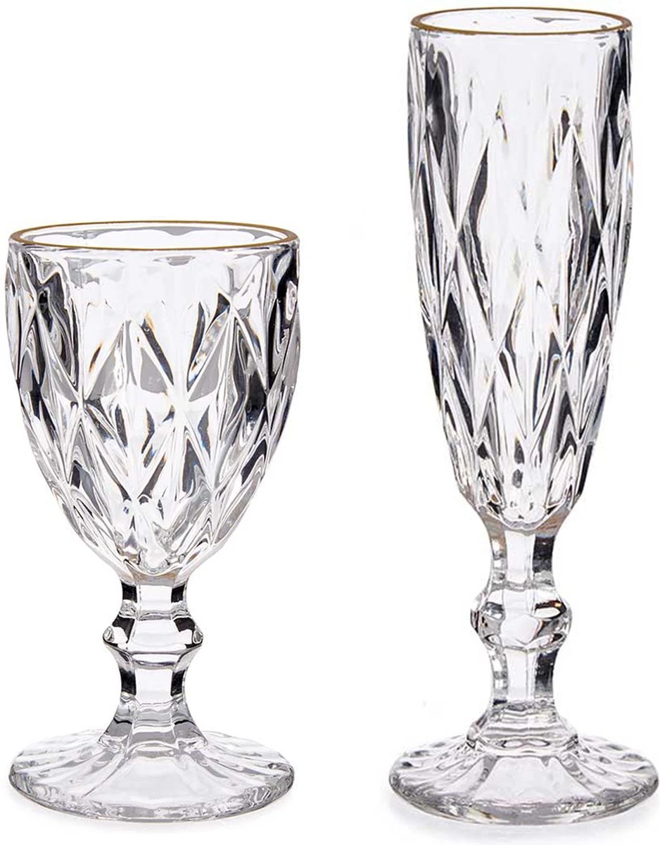 Un ensemble de 12 verres à vin de luxe et coupes à champagne. Ces beaux verres ont une bordure dorée et un aspect cristal taillé. Dimensions : 8 x 8 x 15,5 cm et 8 x 8 x 10 cm. Passe au lave-vaisselle : oui. Matière : verre. Contenu de la livraison : 6 verres à vin 254 ml et 6 verres à champagne 170 ml.