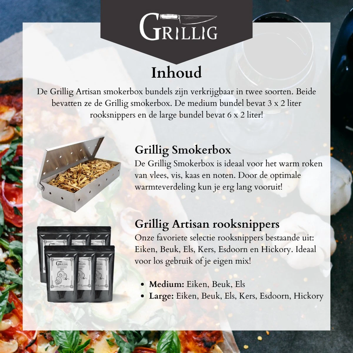 Le bois fumé est ce qui donne du goût à vos produits. Choisissez donc le bois qui voor jou convient le mieux ! (par exemple pomme, hêtre, aulne ou un mélange. Chez Grillig, nous avons une gamme sans cesse croissante de mites de fumée, de copeaux et de morceaux !